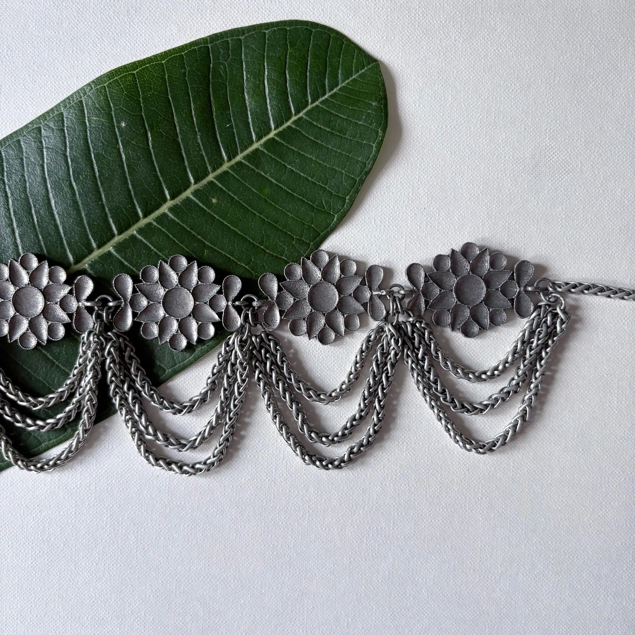 Inspired by the timeless beauty of garden blossoms, this choker features a row of handcrafted floral medallions joined by gently draping chains, creating a statement that feels both organic and modern.