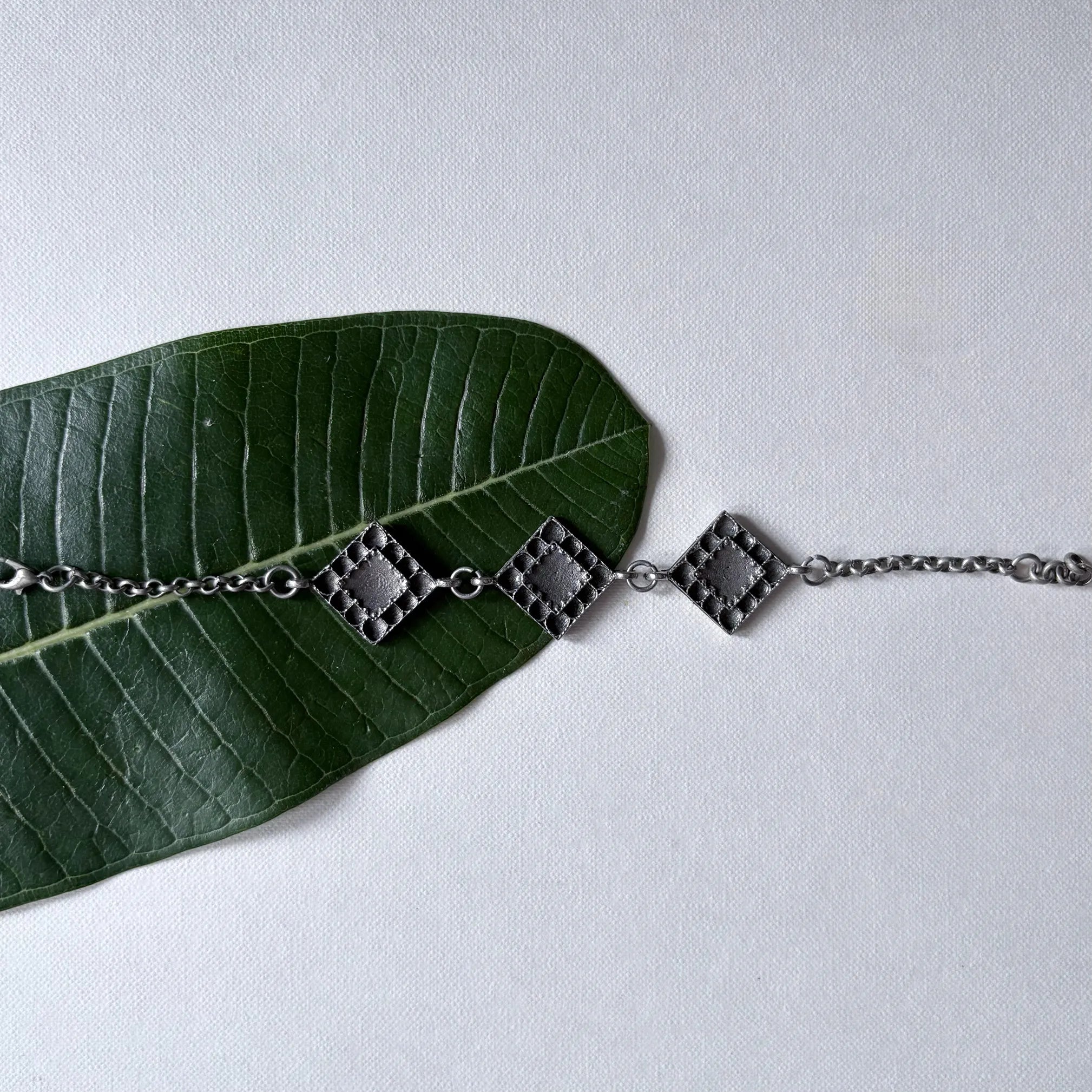 Handcrafted in oxidised German silver, the bead line features alternating smooth and ribbed spheres for depth. Each charm is cast, filed, and hand-finished, giving the bracelet a soft antique sheen.