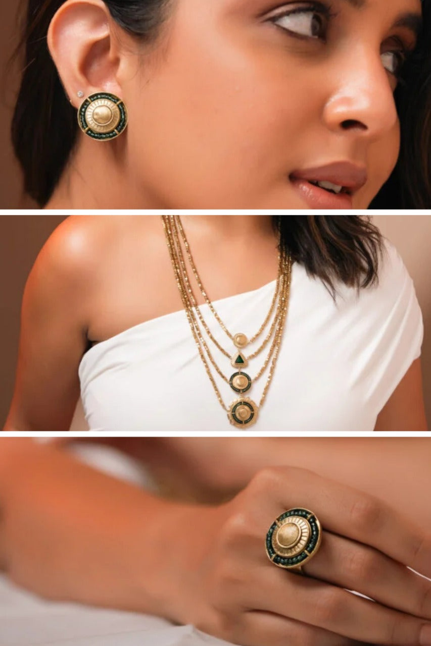 Handcrafted Bahar Ring, Stud Earrings & Sehr Haar Necklace Combo – Brass Jewelry