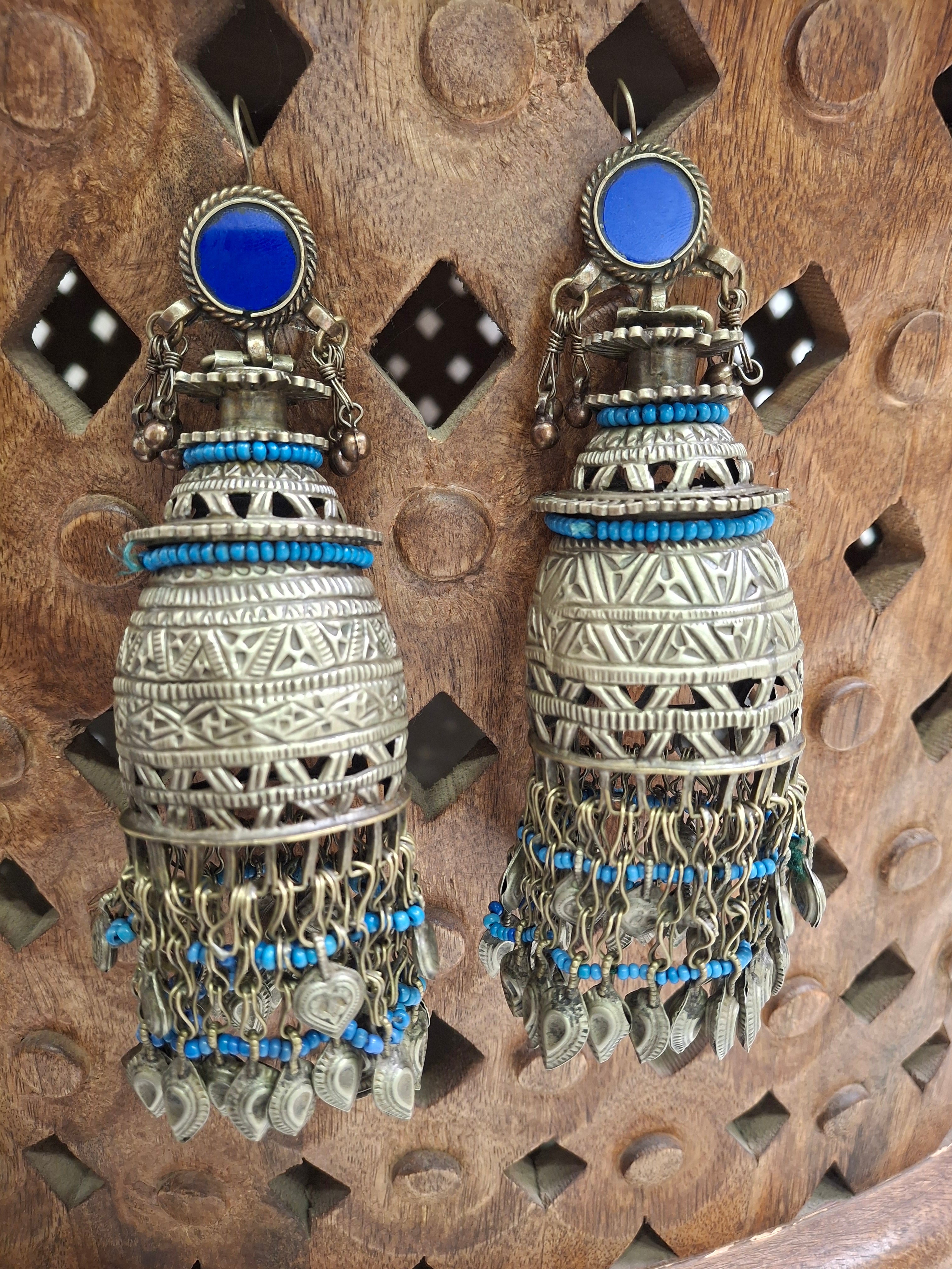 German Silver Vintage Jhumka Earrings with Blue Bead Accents