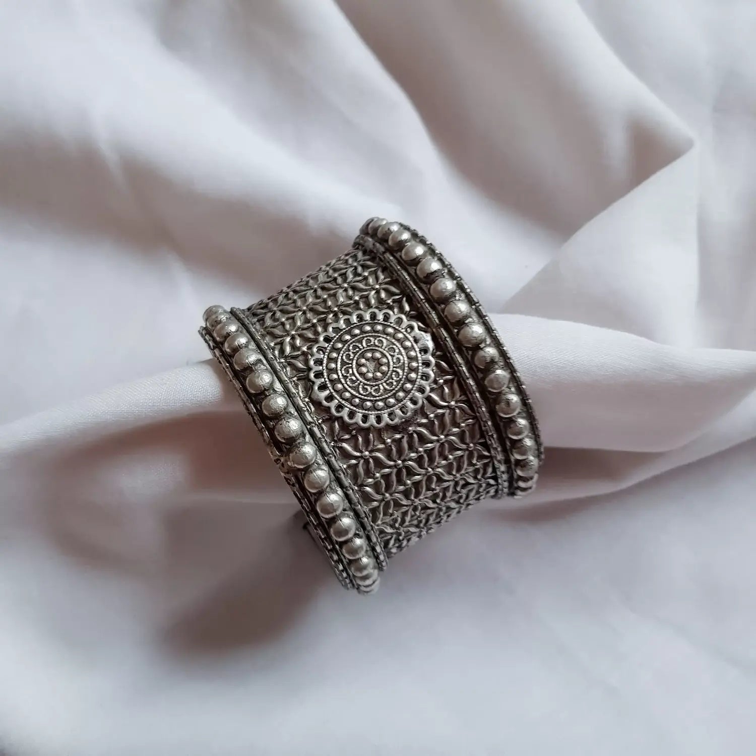 - Introducing the stunning Carved Flower Kada bangle, perfect for Navratri festivals, everyday wear, parties, and weddings. Crafted with a brass base metal and coated with German silver, this bangle boasts an antique polish that exudes elegance and sophistication. Elevate your style with this must-have accessory.