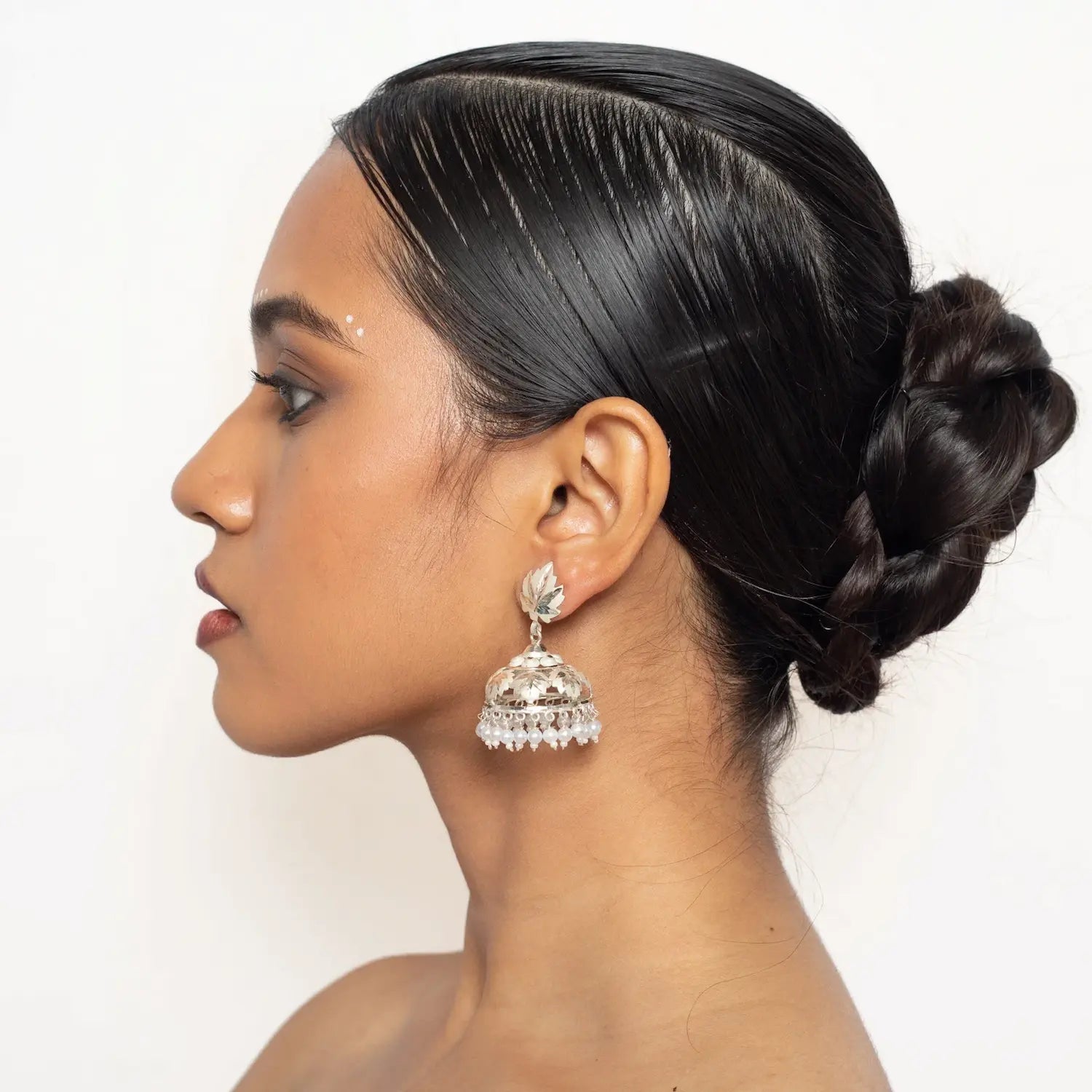 - Introducing the Chinar Jhumki Earring, a small and elegant accessory perfect for weddings, festivals, and special occasions. Made of silver with a beautiful pearl jhumka, this earring adds a touch of sophistication to any outfit. Enhance your style with this stunning silver piece.