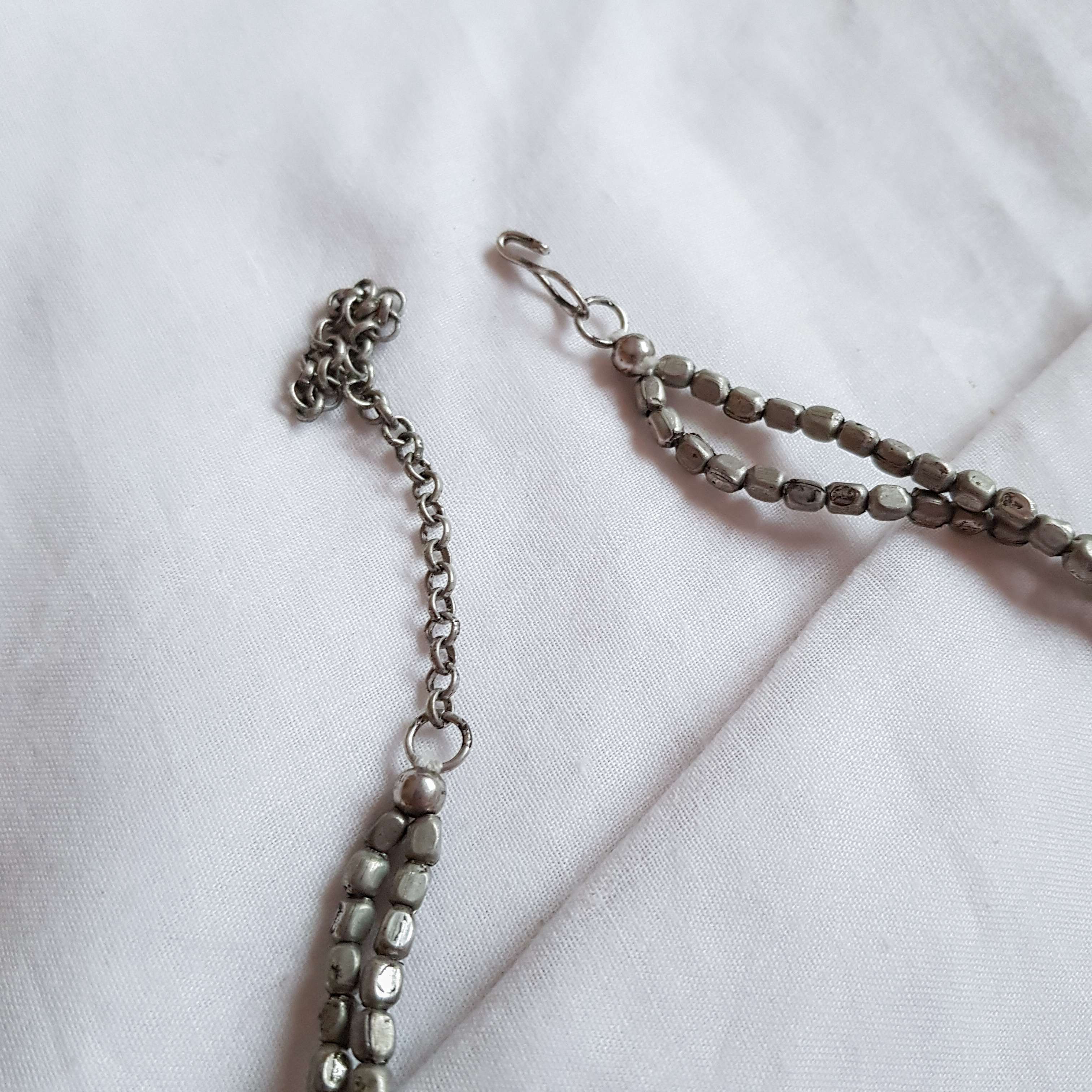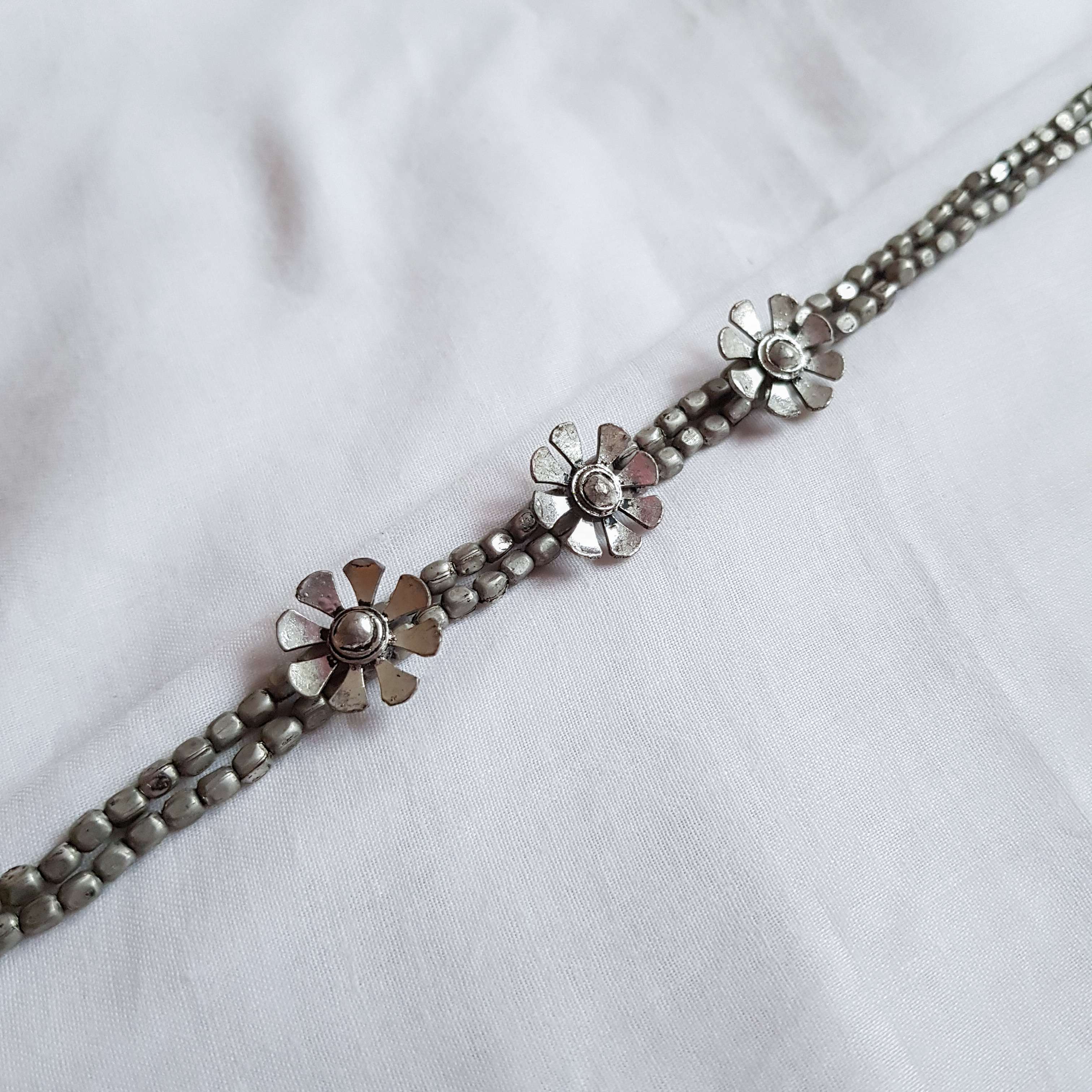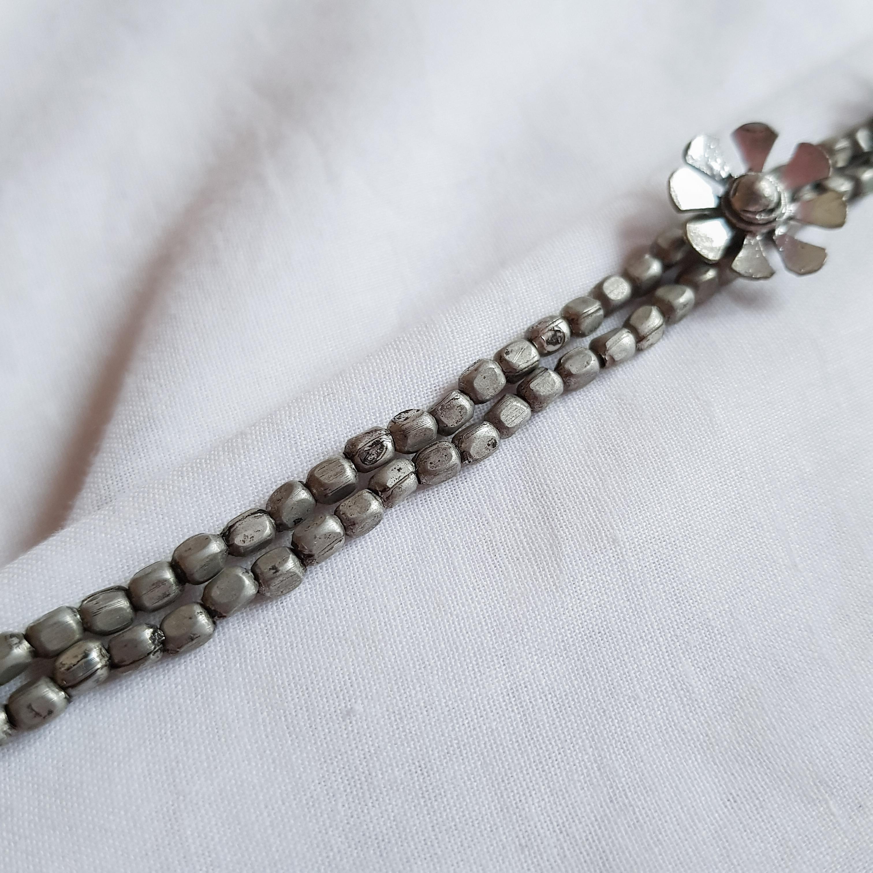 Adorn your neckline with the elegant Daisy Choker. This piece, crafted from brass with an antique-polished German silver coating, features delicate daisy motifs along a structured double-strand design. A confident and versatile accessory for a charming addition to any look.