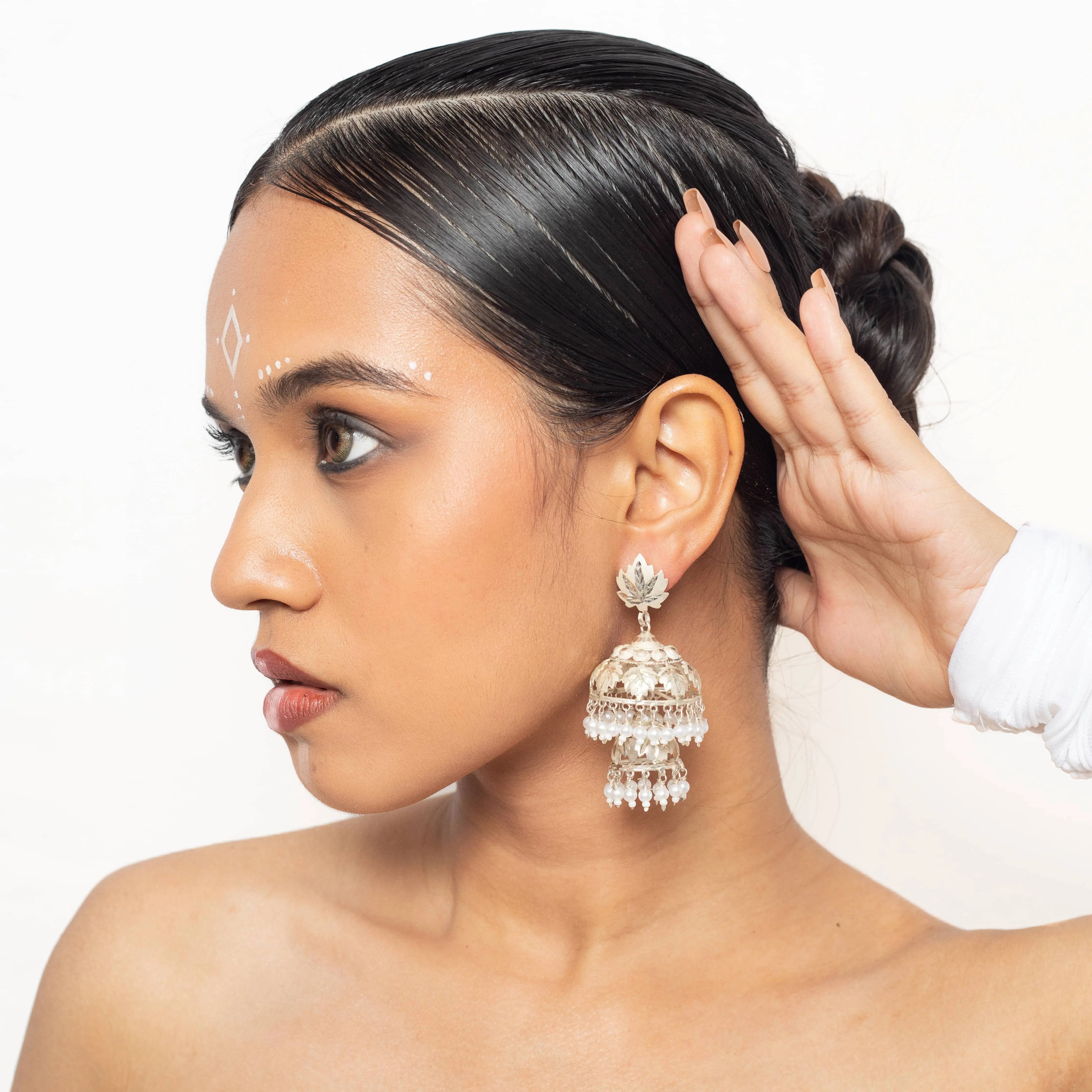 - These Domanzil earrings are perfect for weddings, festivals, and special occasions. They feature a long jhumka design made of silver with a pearl jhumka. These earrings are elegant and stylish, making them a great addition to any jewelry collection.