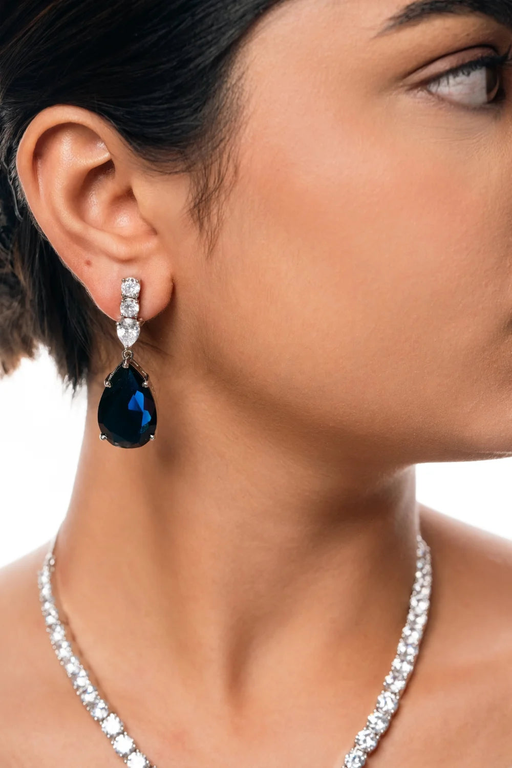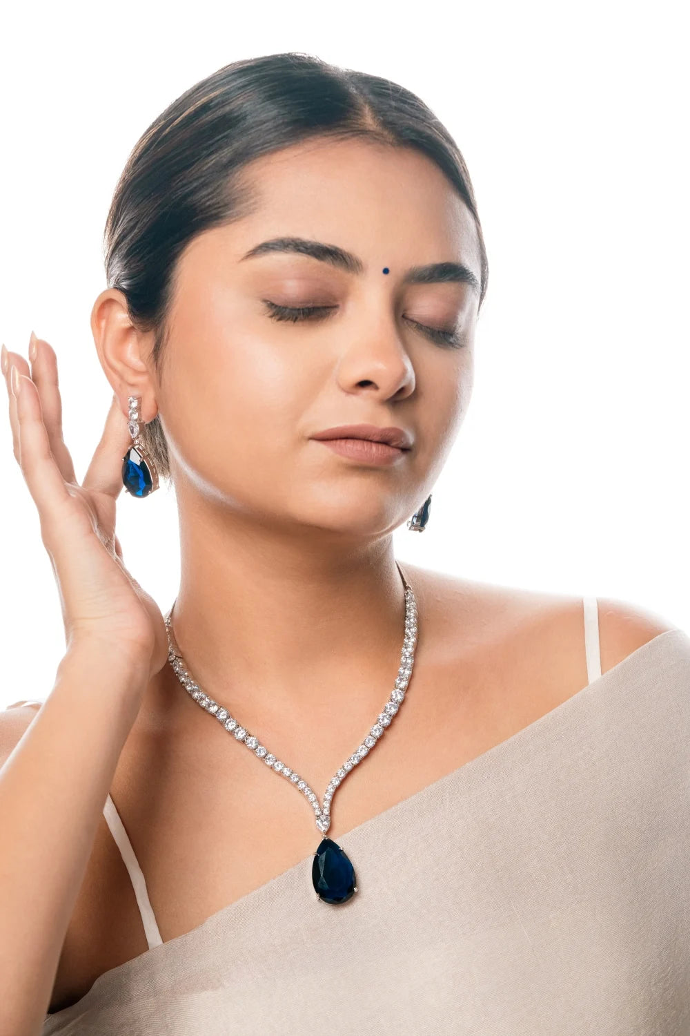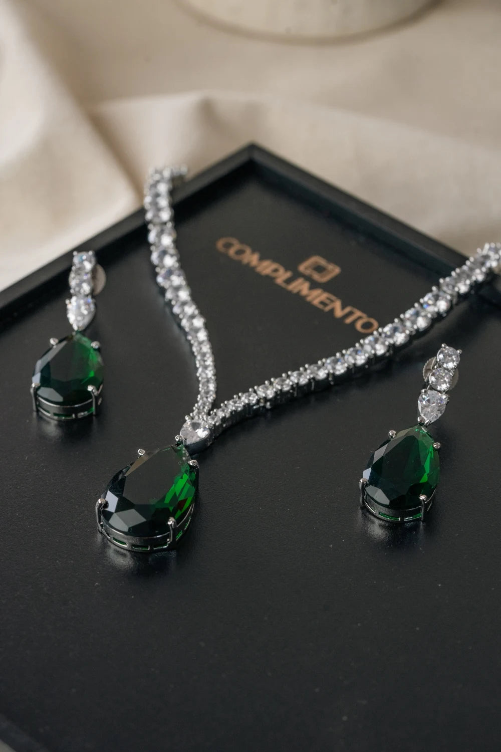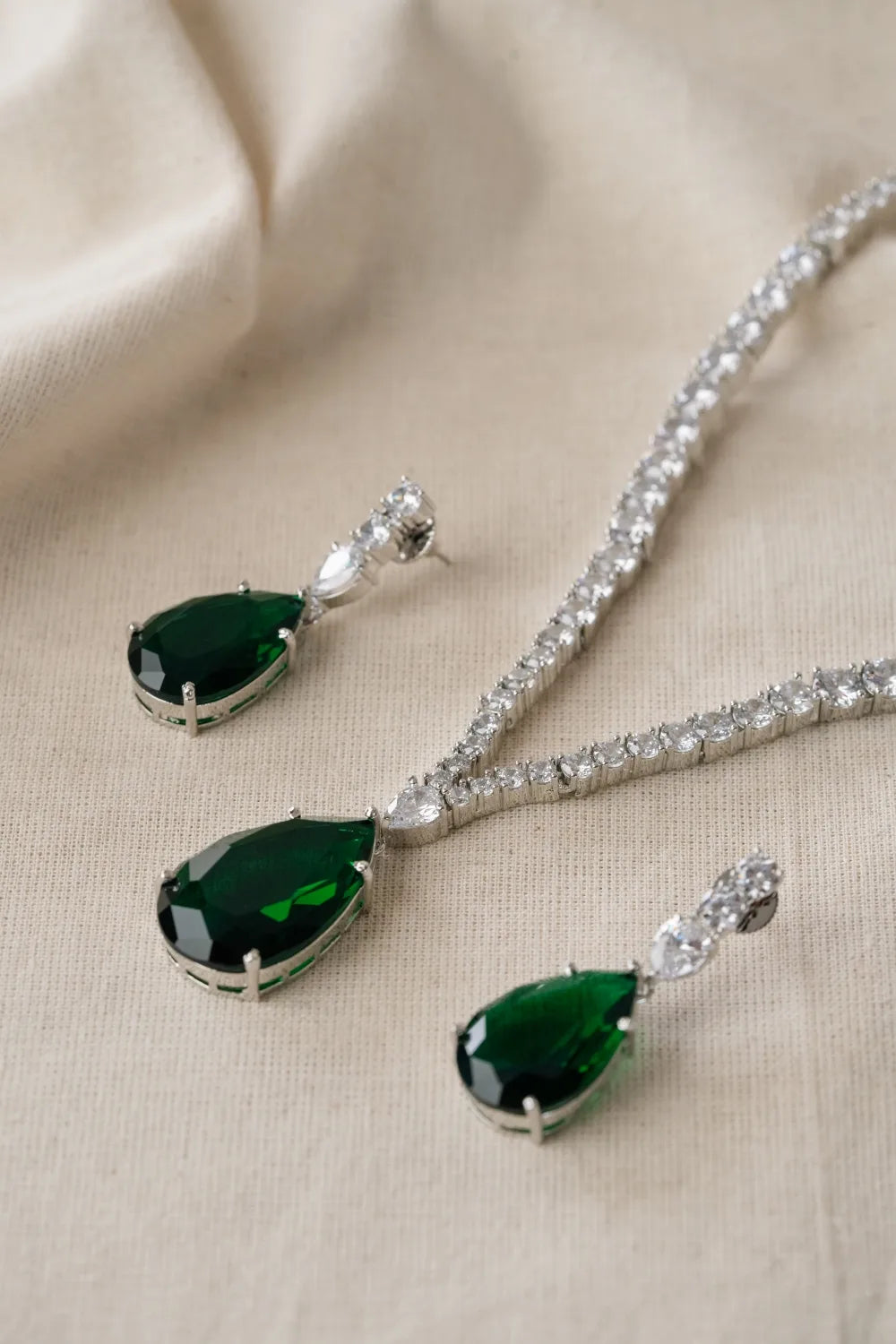 The Emerald Brilliance set features a pear-shaped emerald, silver-polished V-chain, and American diamonds. This statement necklace, inspired by Radhika Merchant, offers a luxurious look with matching earrings, making it a perfect choice for standout elegance.