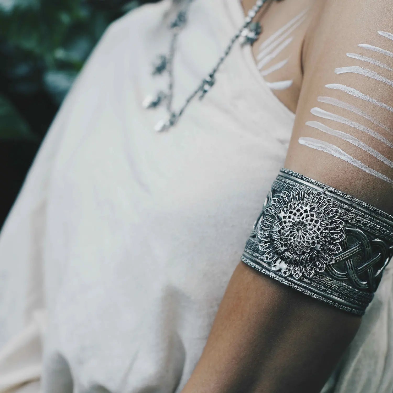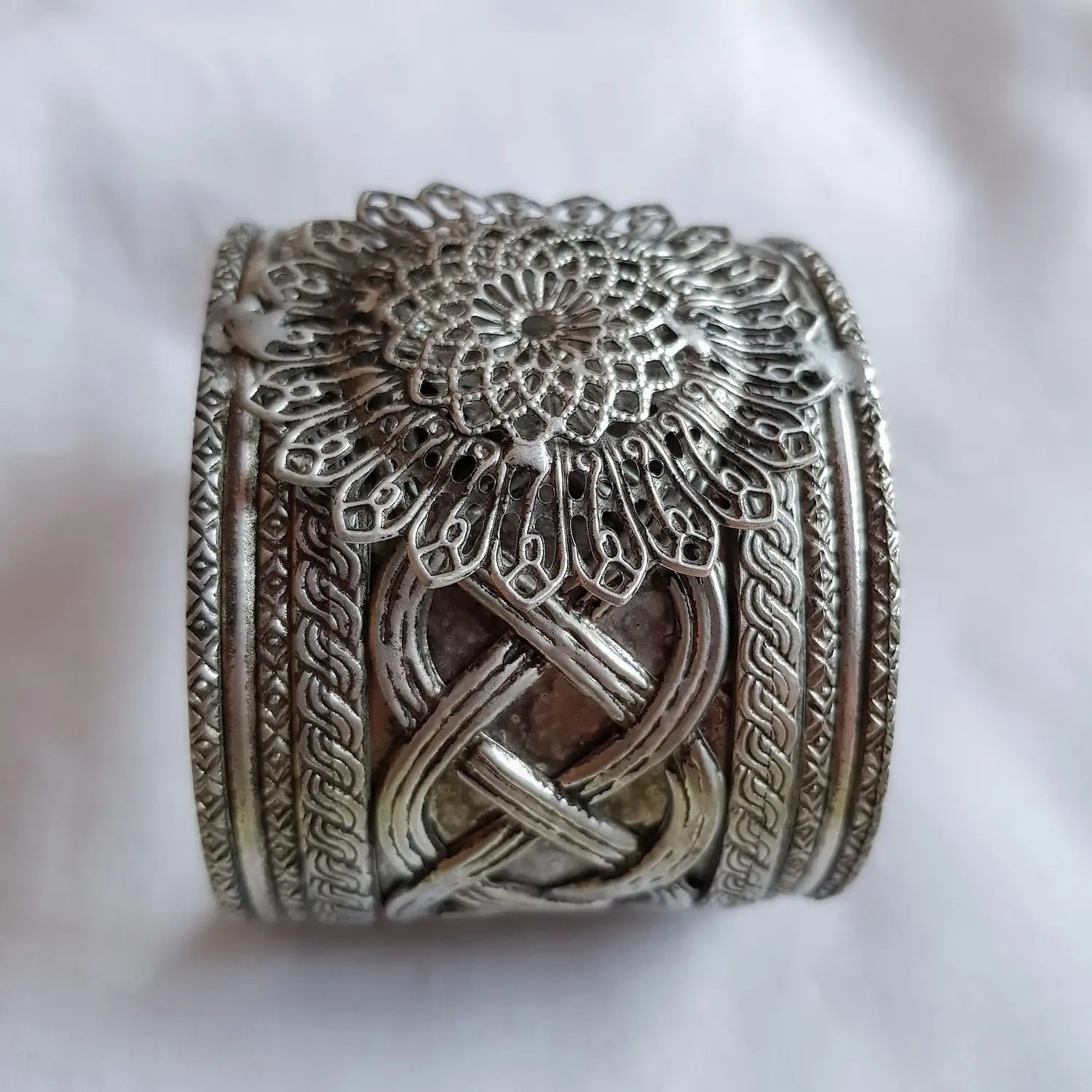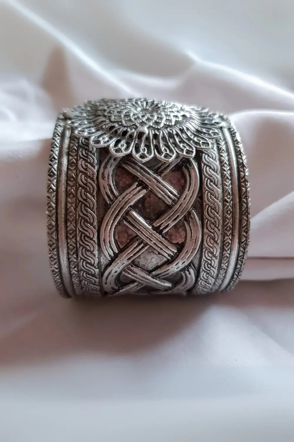 - The Flower Wave Kada is a versatile bangle suitable for various occasions such as Navratri festival, everyday wear, parties, and weddings. The bangle is made of brass as the base metal, coated with German silver, and finished with an antique polish. The combination of materials used in the production of this bangle ensures durability and longevity. The silver coating adds a touch of elegance and sophistication to the design, making it a perfect accessory for any outfit. The Flower Wave Kada is a must-have for anyone looking to add a touch of traditional charm to their wardrobe.