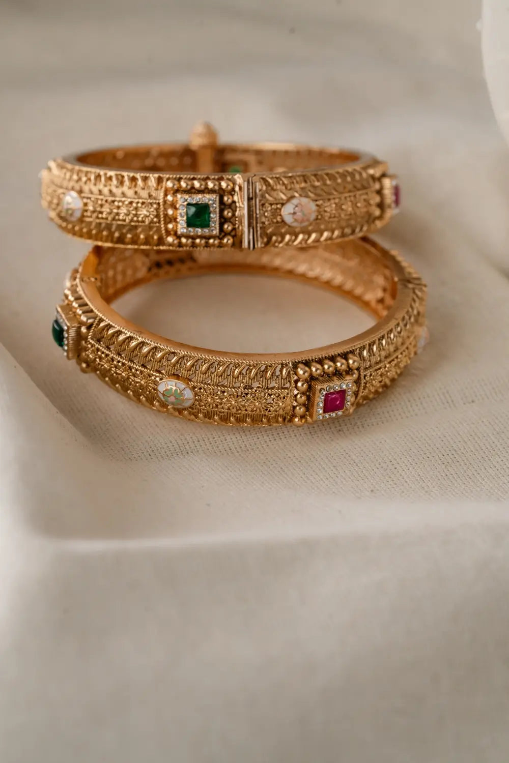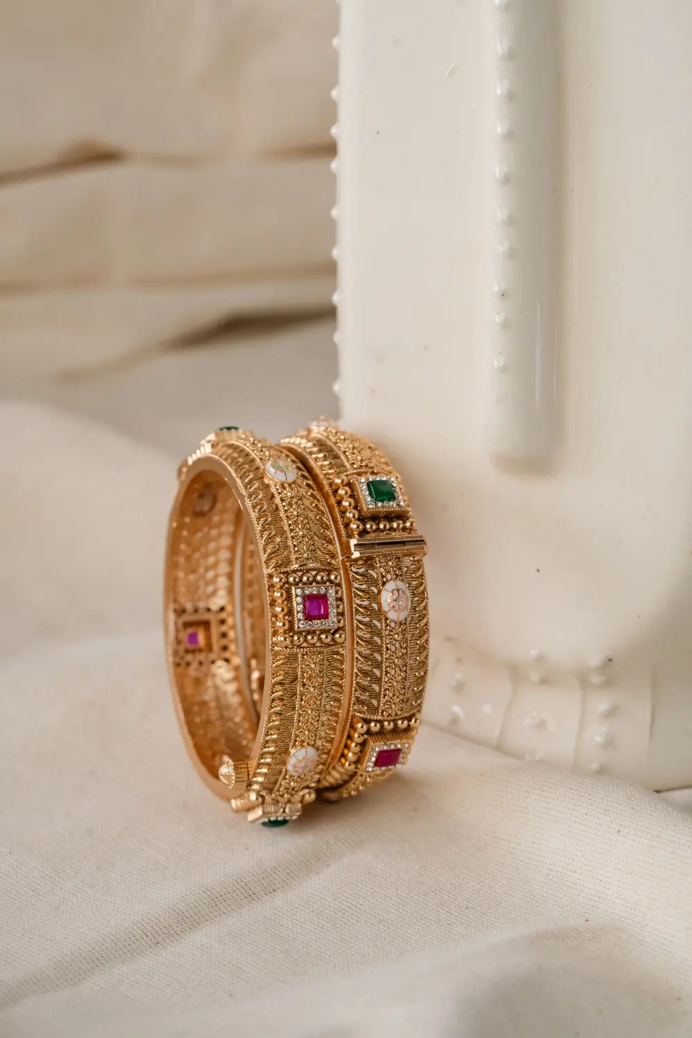 Experience a fusion of tradition and modernity with these golden polish Kundan bangles. Featuring unique, off-centered geometric designs and clean lines, crafted in durable brass with delicate textures and subtle embellishments, they blend Indian motifs with contemporary Western styles.