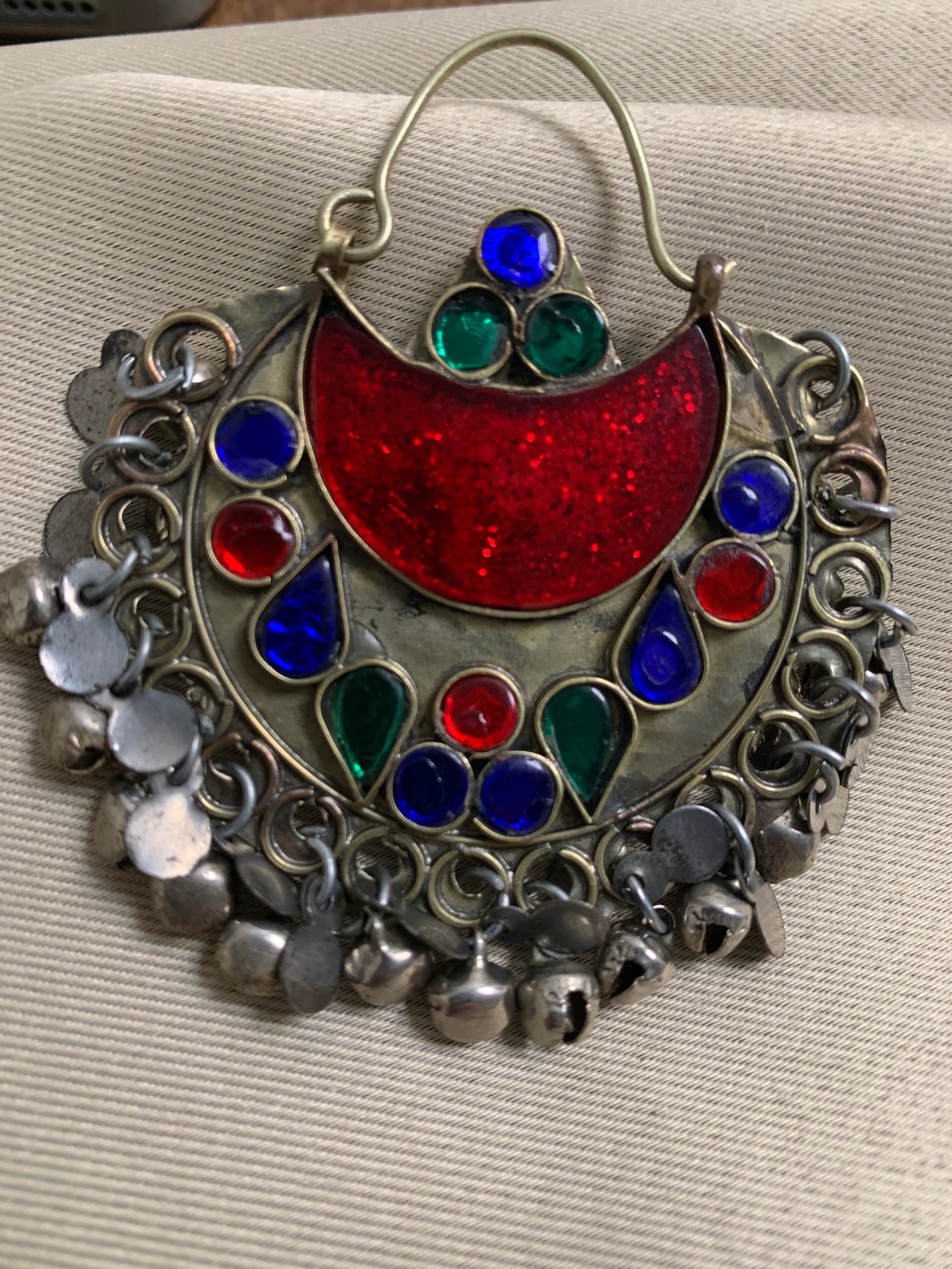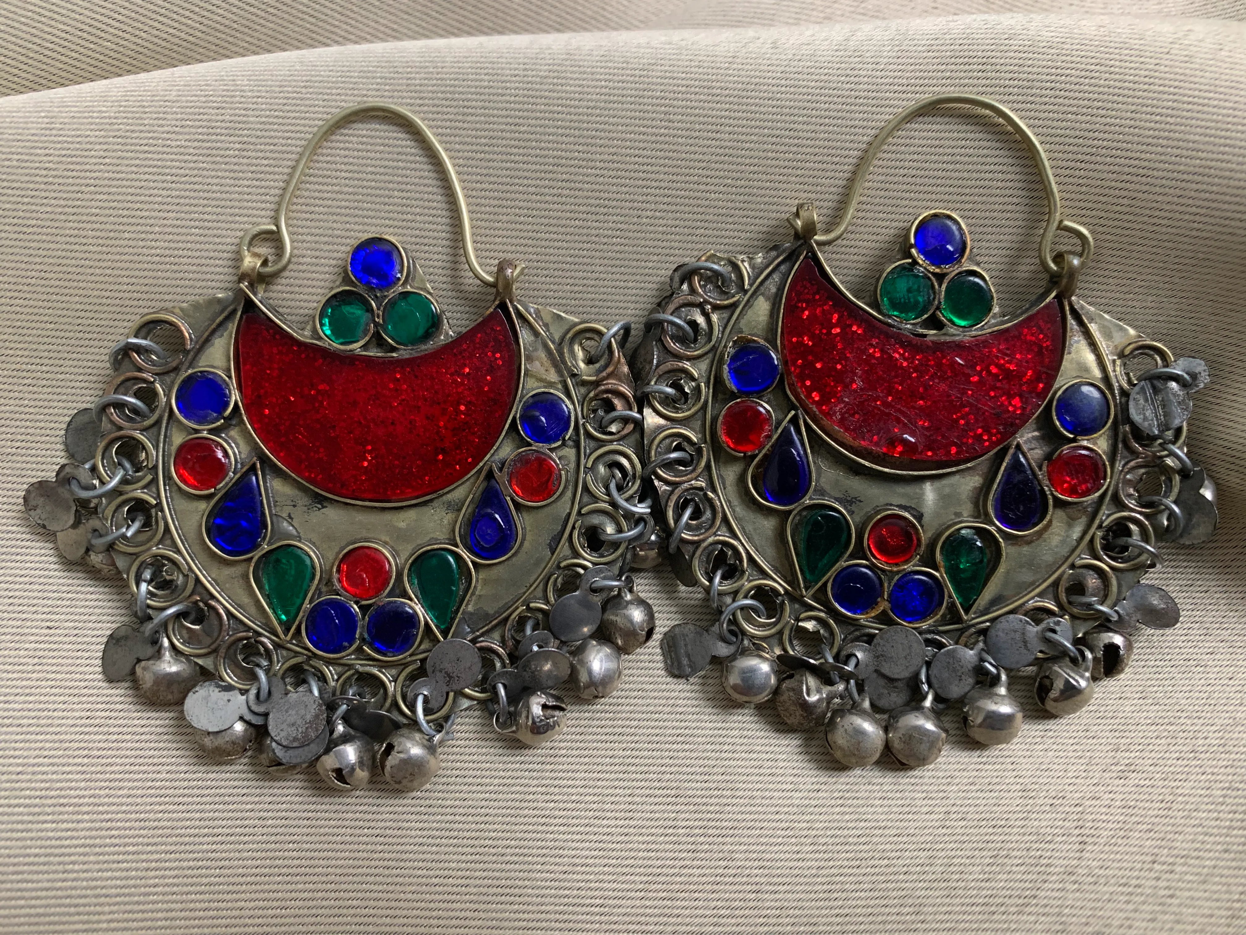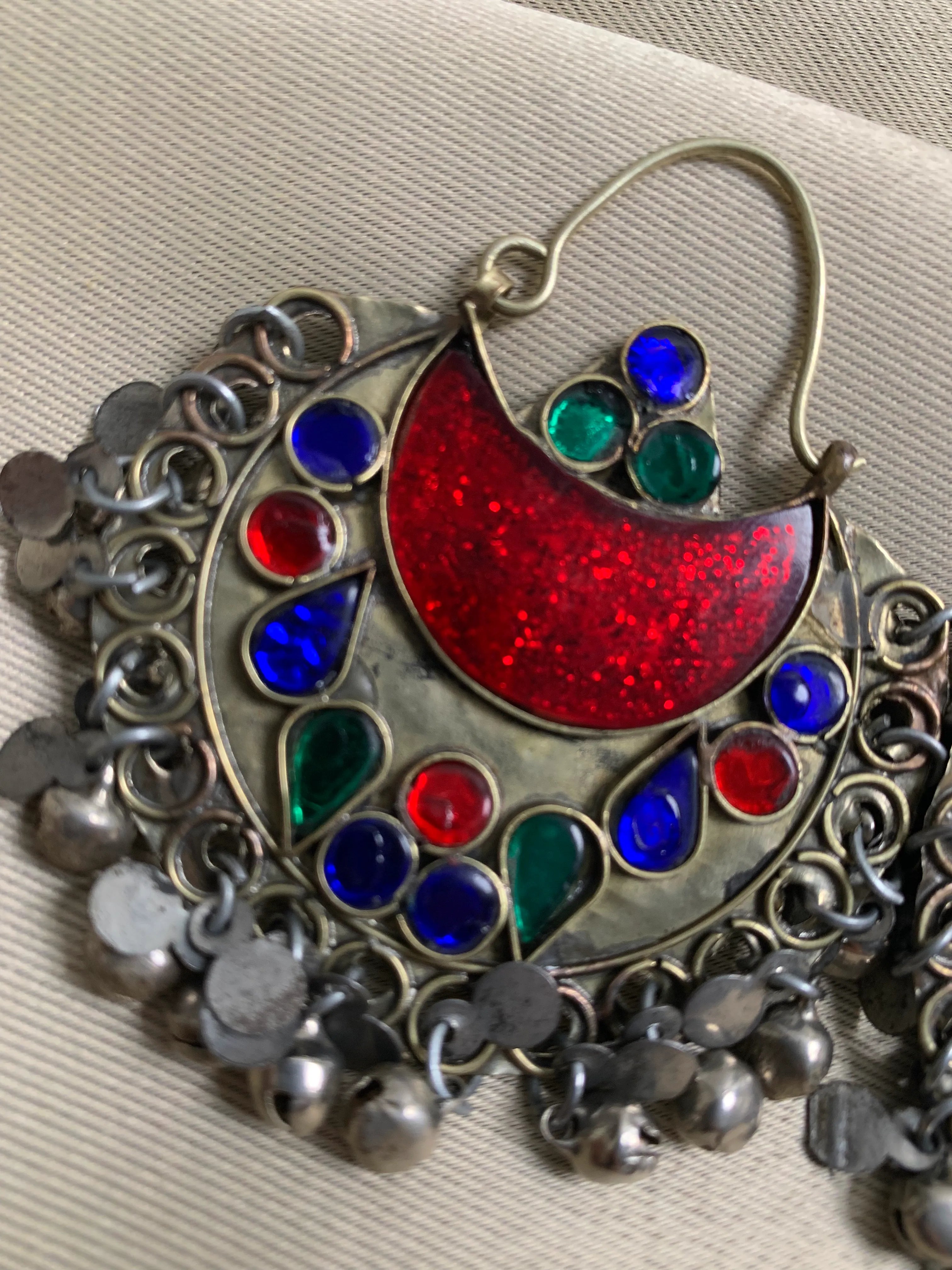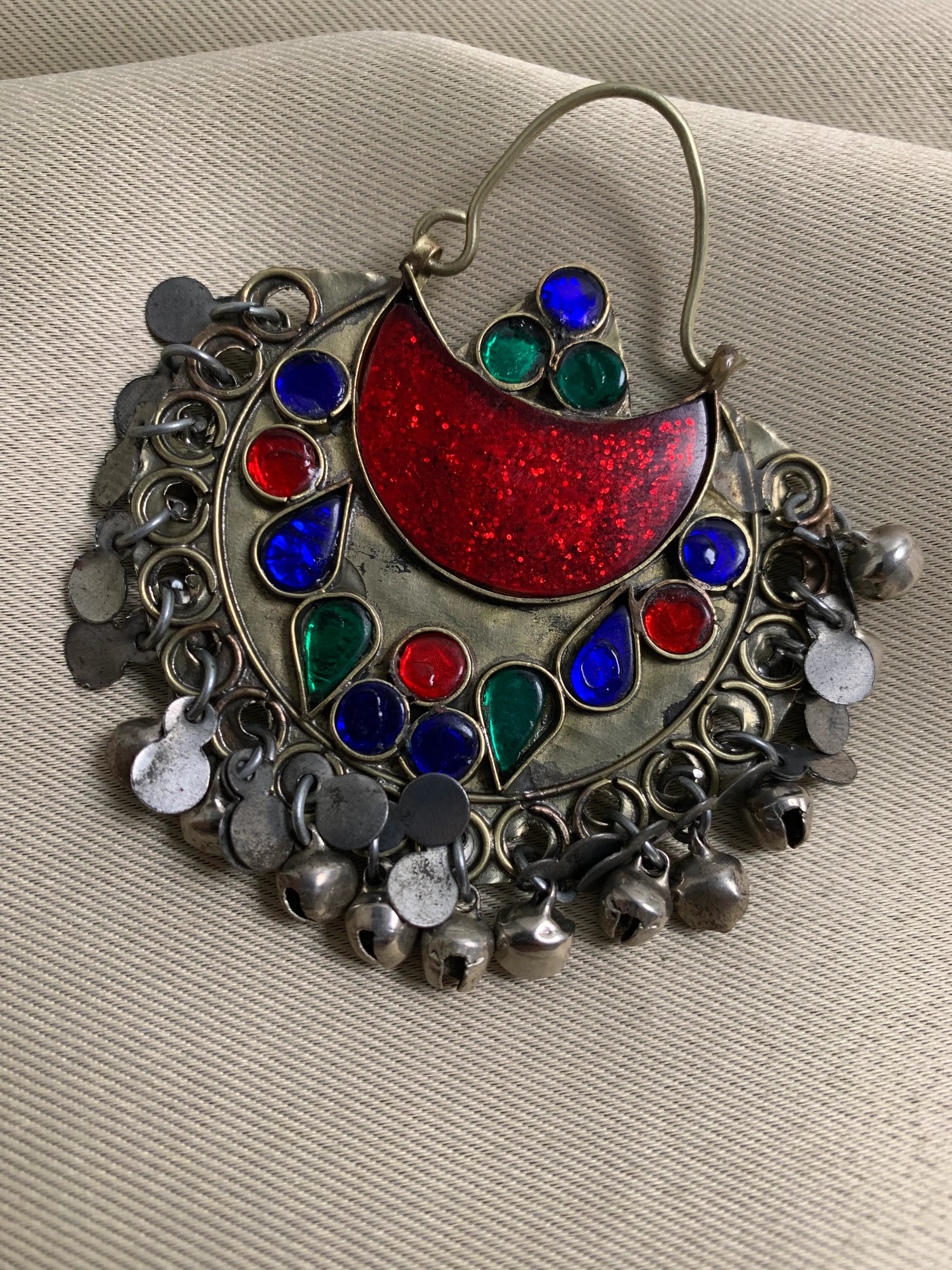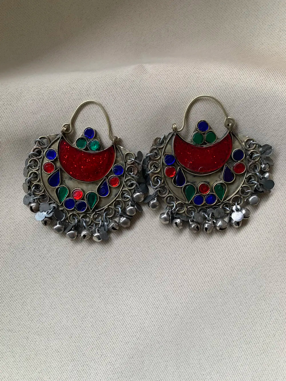 These German Silver Chandbali Earrings feature a striking crescent moon centerpiece highlighted by a medley of red, green, and blue beads. The ornate circular frame, intricate metalwork, and dangling ghungroo charms bring together color, movement, and tradition in a timeless design.