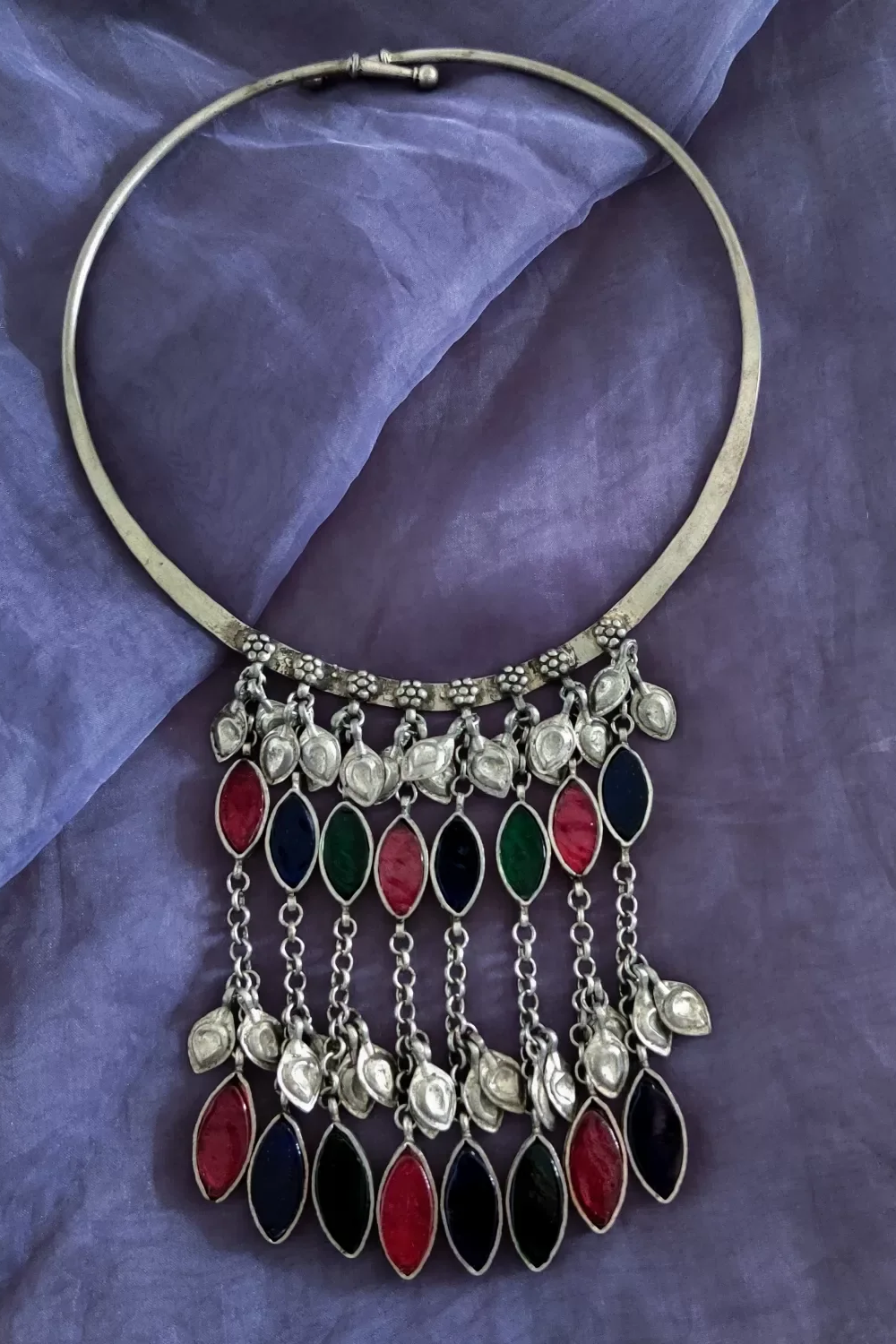 - Discover the Glasswork Hasli Necklace, a captivating hasli necklace designed to celebrate your individuality. Whether you’re attending festivals, weddings, parties, or simply going about your day, this exquisite piece will effortlessly enhance your outfit. The silver hue gracefully harmonizes with the vibrant red, blue, and green accents, exuding elegance and charm.