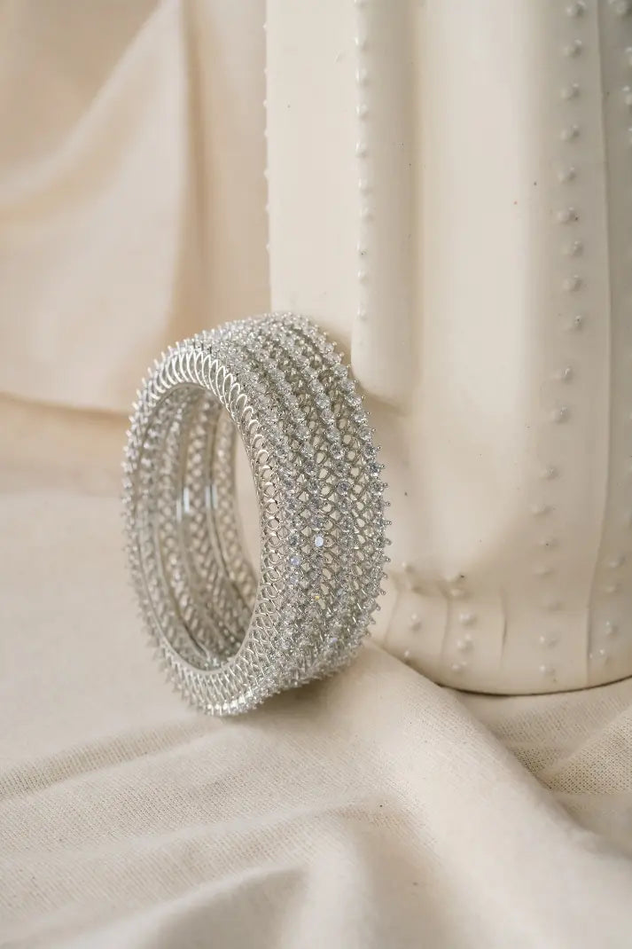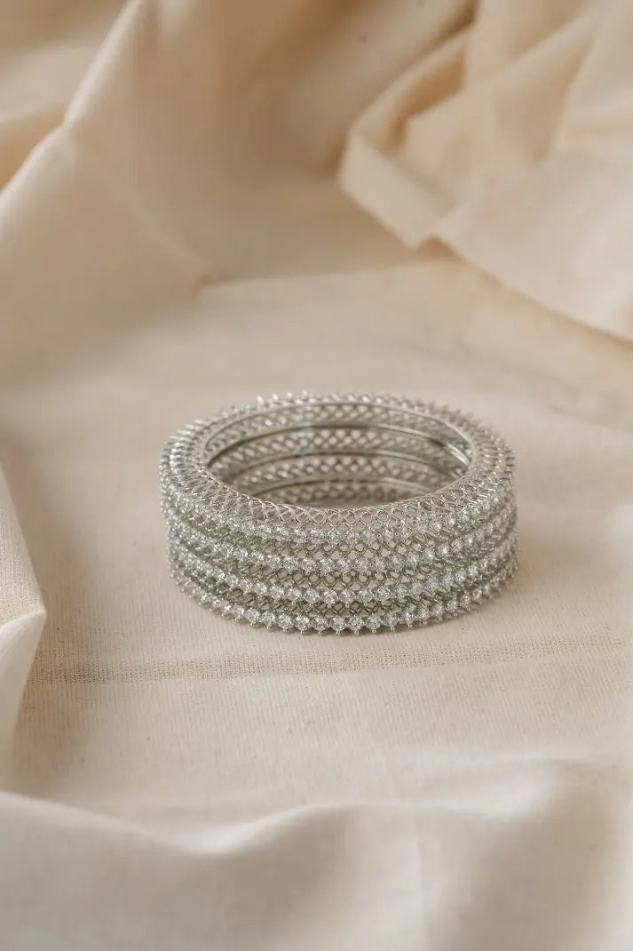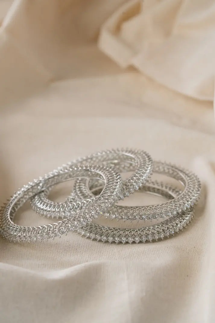 Shine effortlessly with Party-Ready Silver AD Bangles. Designed with lightweight brass and sparkling zirconia, these affordable bangles complement wedding and party outfits with ease.