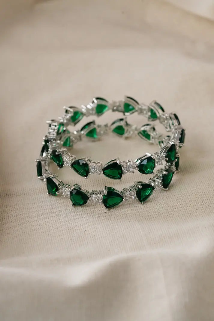 Experience timeless elegance with these silver-polished emerald and diamond bangles. Crafted with intricate detailing, vibrant emerald gemstones, and sparkling diamonds, this exquisite jewelry piece exudes luxury. Perfect for any occasion, it adds a captivating charm to your ensemble.