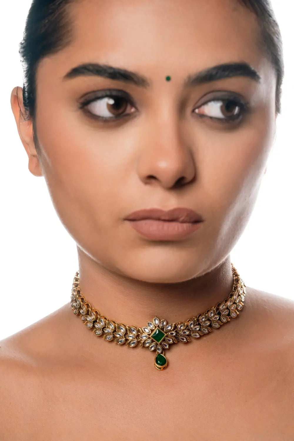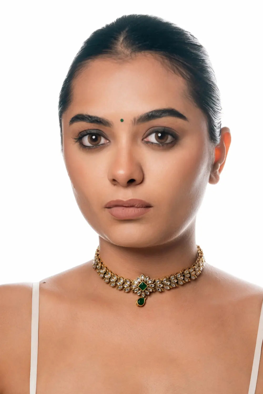 This elegant Matha Patti features a golden touch with vibrant green enamel. Handcrafted with premium Kundan stones and shimmering diamonds, it showcases intricate detailing and craftsmanship. Versatile for various hairstyles, this luxurious piece adds sophistication and can even be worn as a necklace.