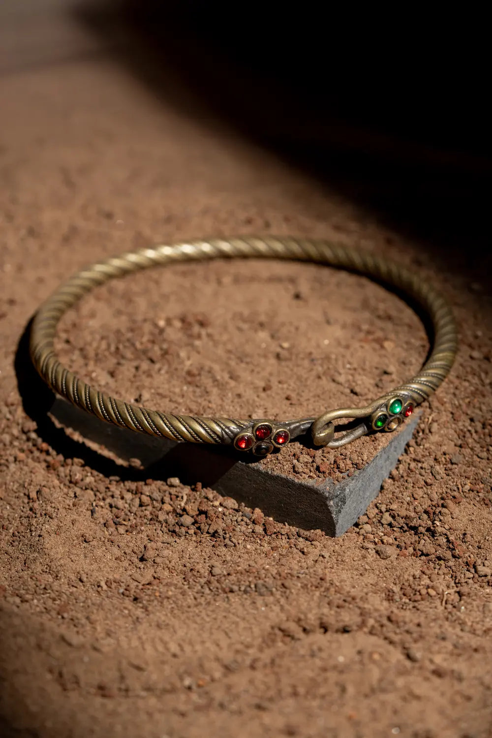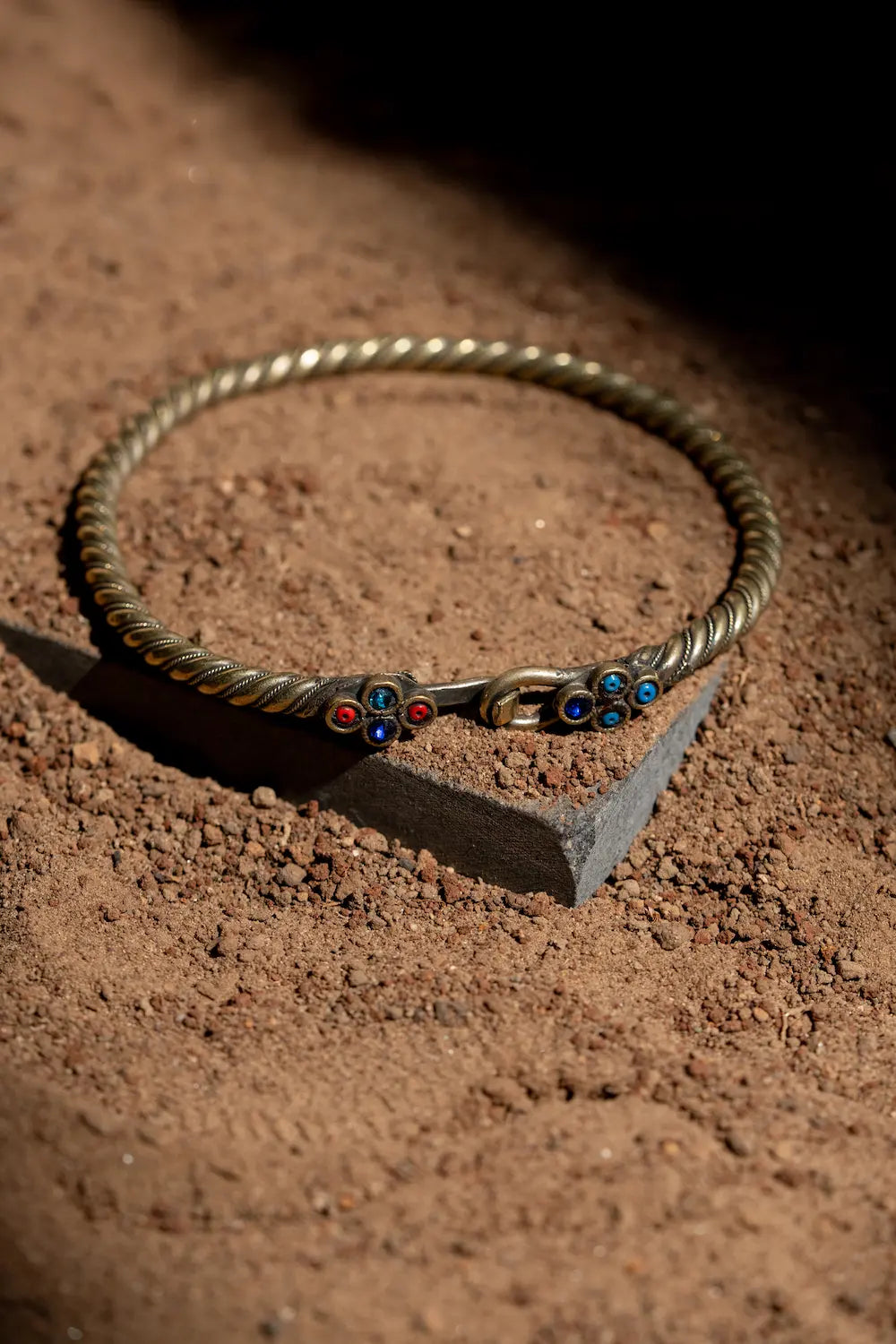 This rigid Kutchi hasli necklace is a handcrafted vintage piece made from German silver, estimated to be over 20 years old. Its bold, rope-like design gives it a strong and traditional tribal presence. At the center is a unique hook-and-eye clasp, flanked by floral cluster embellishments. These detailed clusters feature small, colorful stones, adding vibrant contrast to the aged silver tone. A striking example of heritage tribal jewelry, perfect for collectors and ethnic wear lovers.