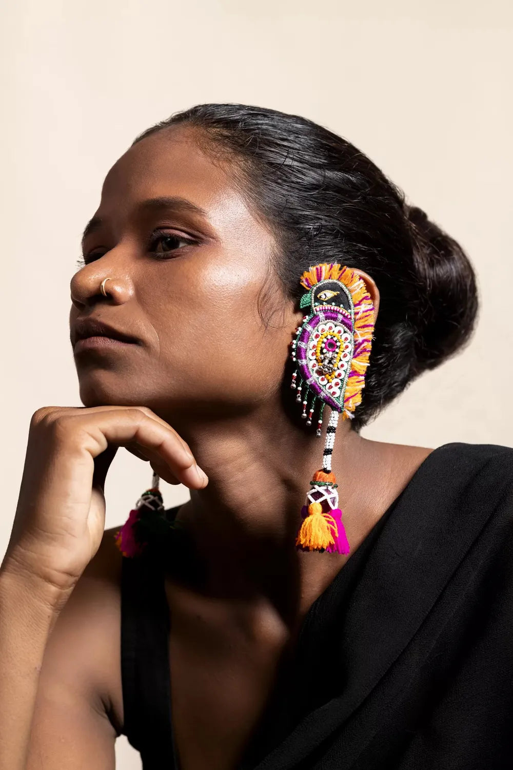 - Shop the exquisite Kruti Arts Handcrafted Earring for festivals. These unique earrings are made with beads, khadi fabric, oxidised metal, silk threads, and wool. Available in various colors – Black, Green, Pink, Yellow, Purple, and White.