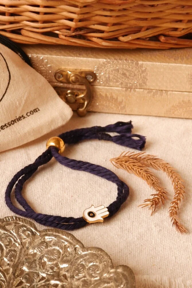 Celebrate Raksha Bandhan with our Humsa Rakhi. Crafted from high-quality 18kt gold plated brass, this rakhi features the Humsa hand, a symbol of protection and good fortune. Show your sibling your love and care with this unique, handmade piece.