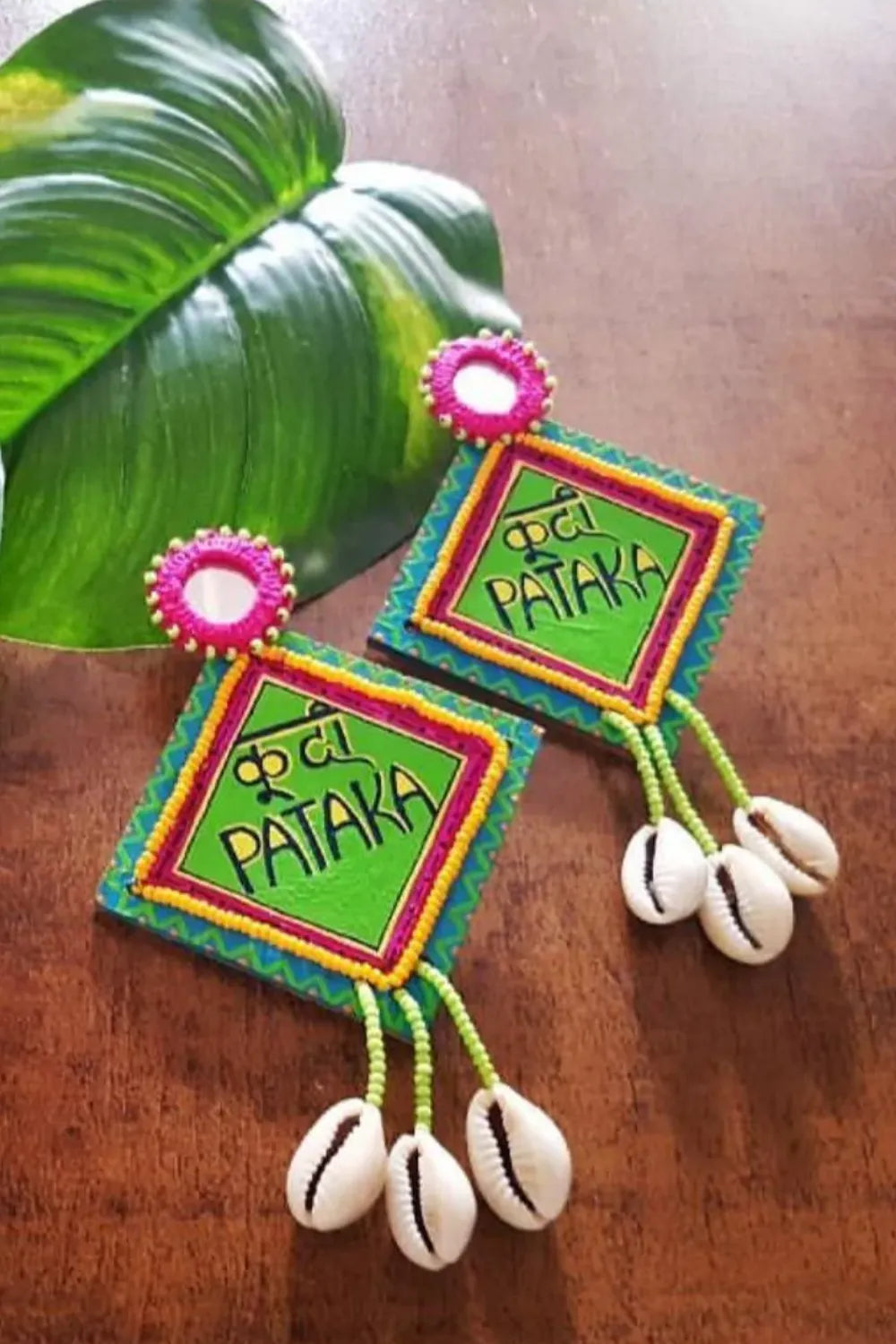 - Shop our exquisite Kruti Arts Handcrafted Earrings for a vibrant Festival look. Expertly designed with acrylic paint, Kodi shell, and wood, they come in Blue, Green, Pink, Yellow, and White. Elevate your style with these unique, colorful accessories.