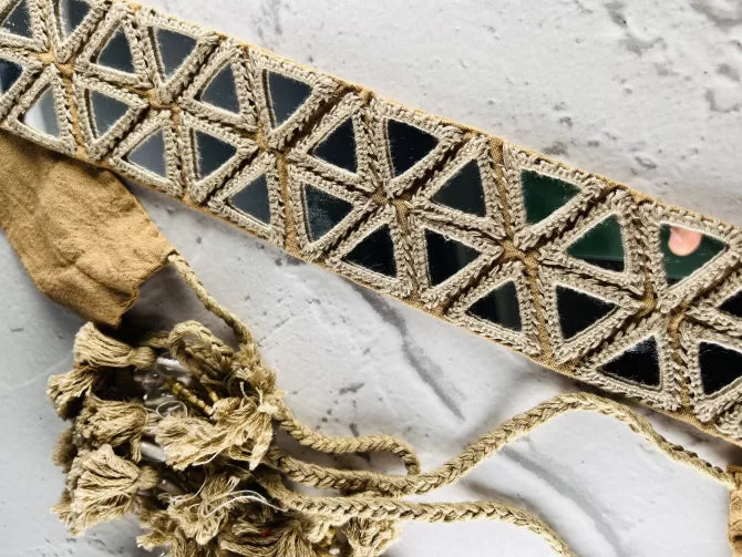 - Elevate your fashion game with our Kutchi Handwork Waist Belt featuring intricate tribal craftsmanship. Adorned with triangle mirrors, it’s the perfect fusion accessory, adding flair to dresses and jeans alike. Achieve a unique and stylish look effortlessly.