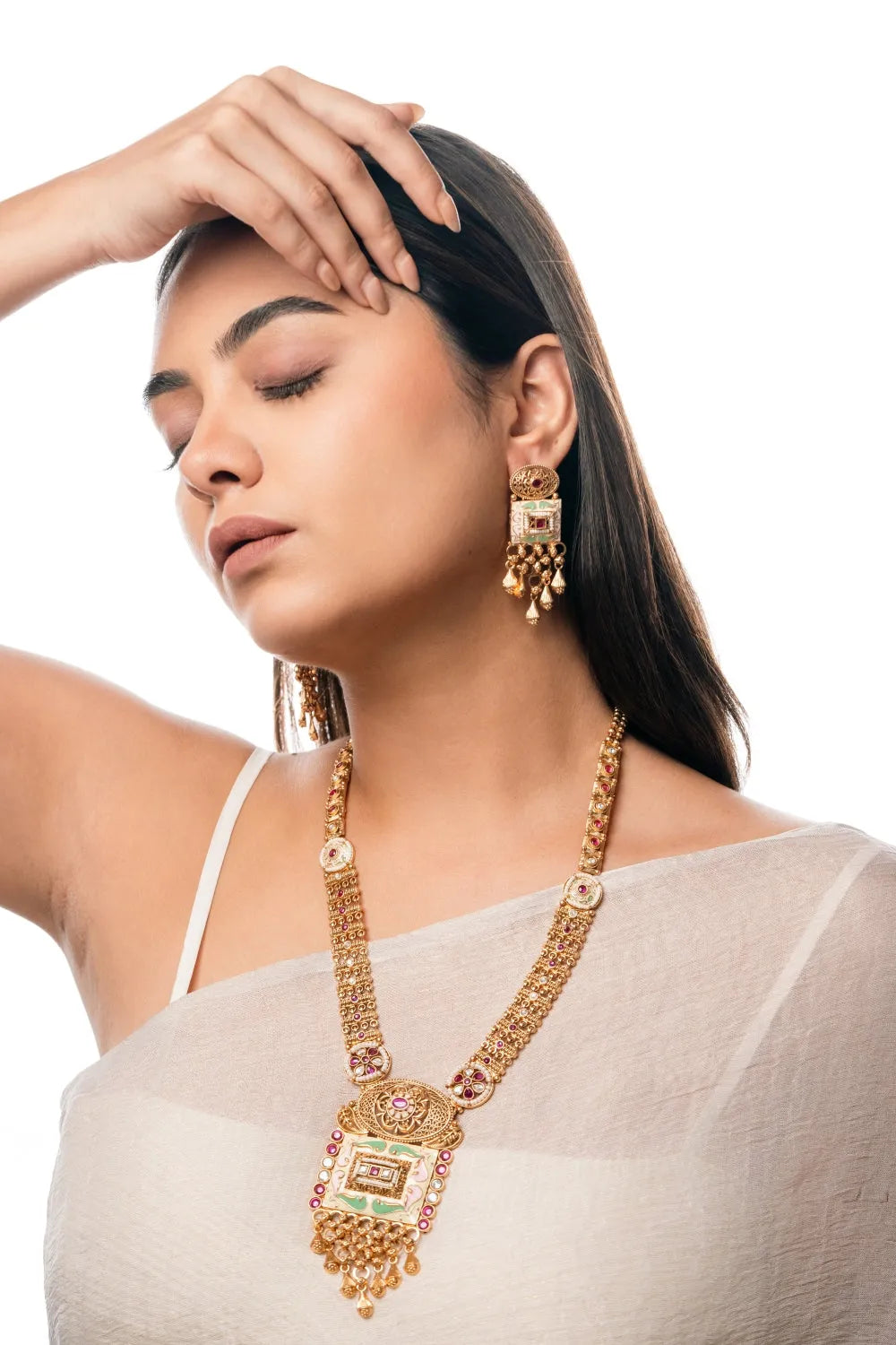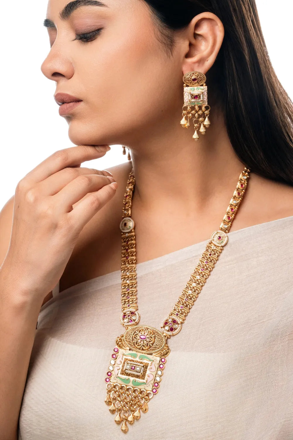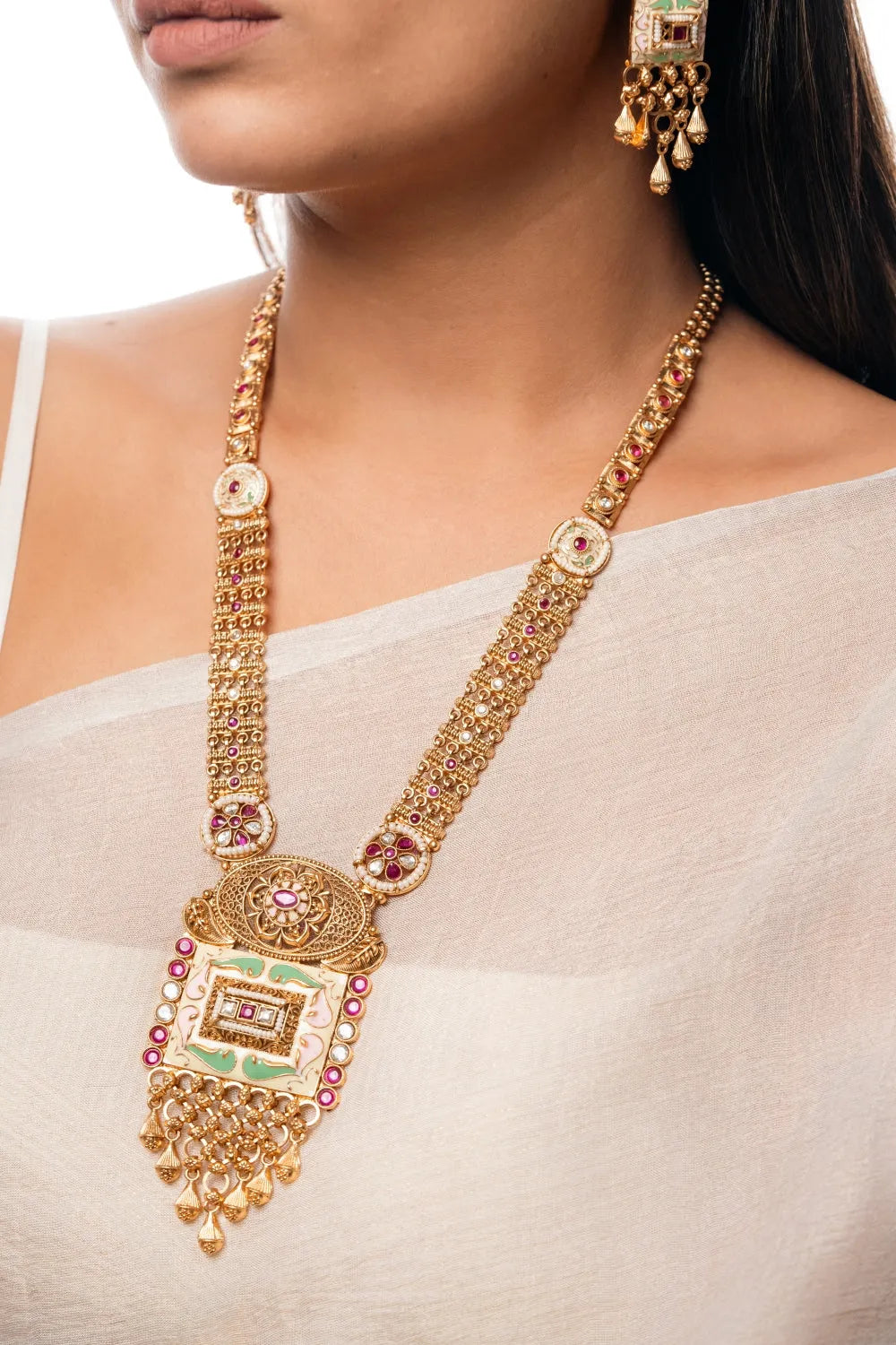 Experience elegance with the Luxe Matte Gold Enamel Square Pendant Necklace Set. Featuring intricate enamel work and gemstone accents, this matte gold-plated set includes matching drop earrings, making it perfect for any special occasion.