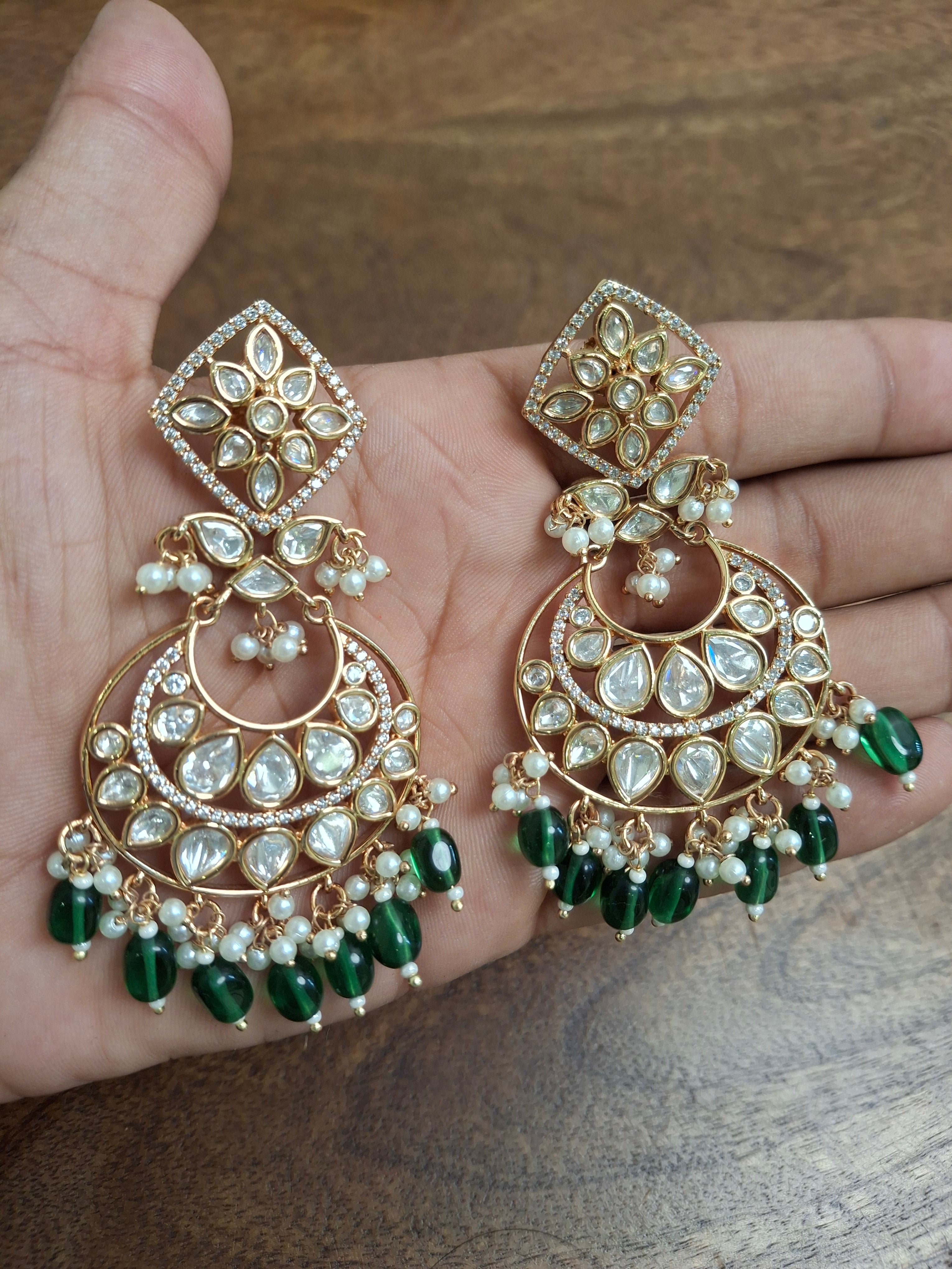 Adorn your look with vibrant gold and green Kundan ethnic earrings. Crafted with intricate patterns, high-quality stones, and a luxurious design, these statement earrings are ideal for weddings, festivals, and other traditional celebrations.