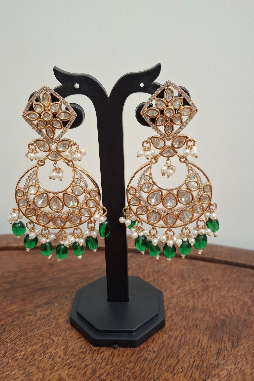 Vibrant Gold-Tone & Green Kundan Ethnic Earrings