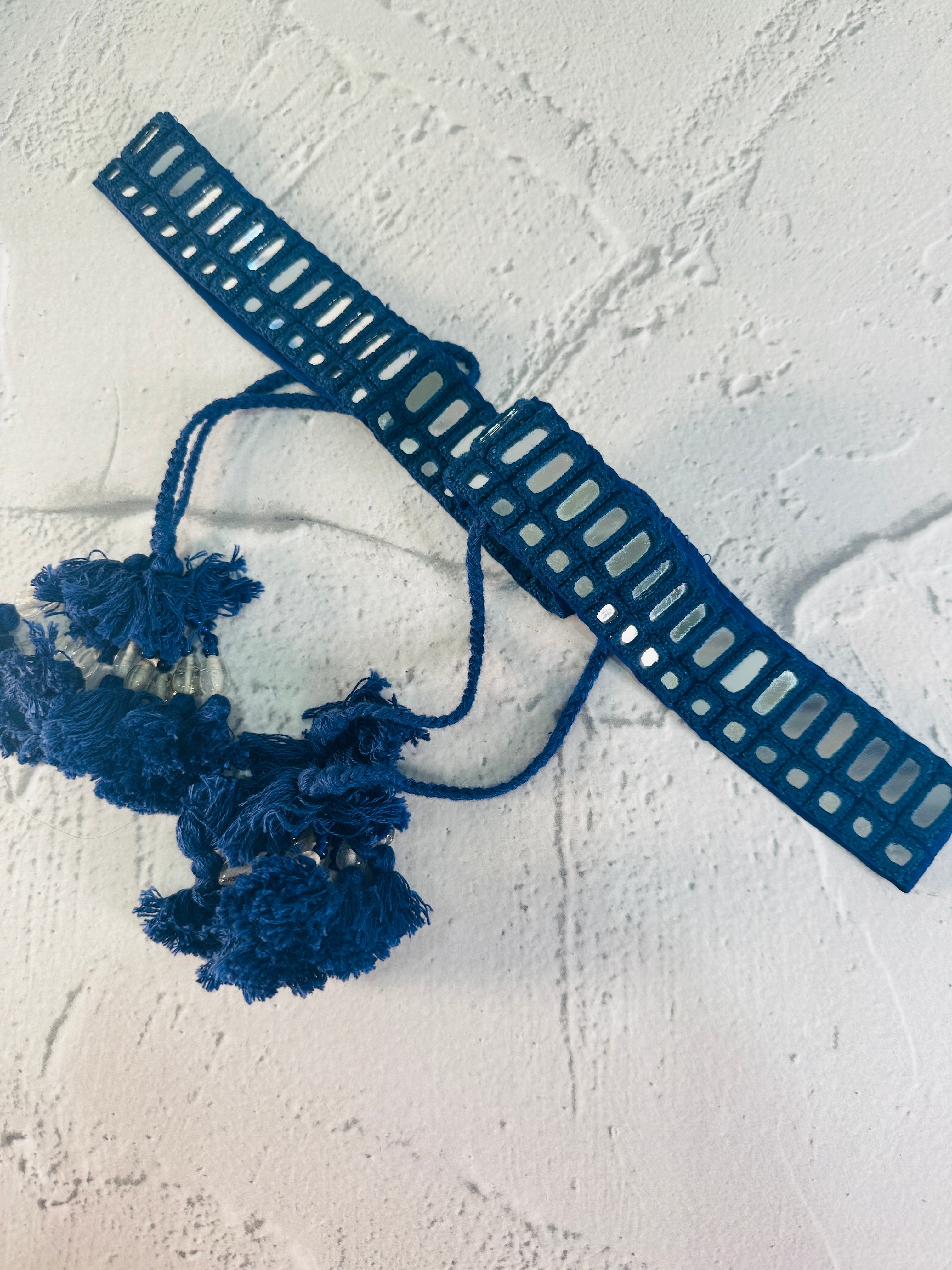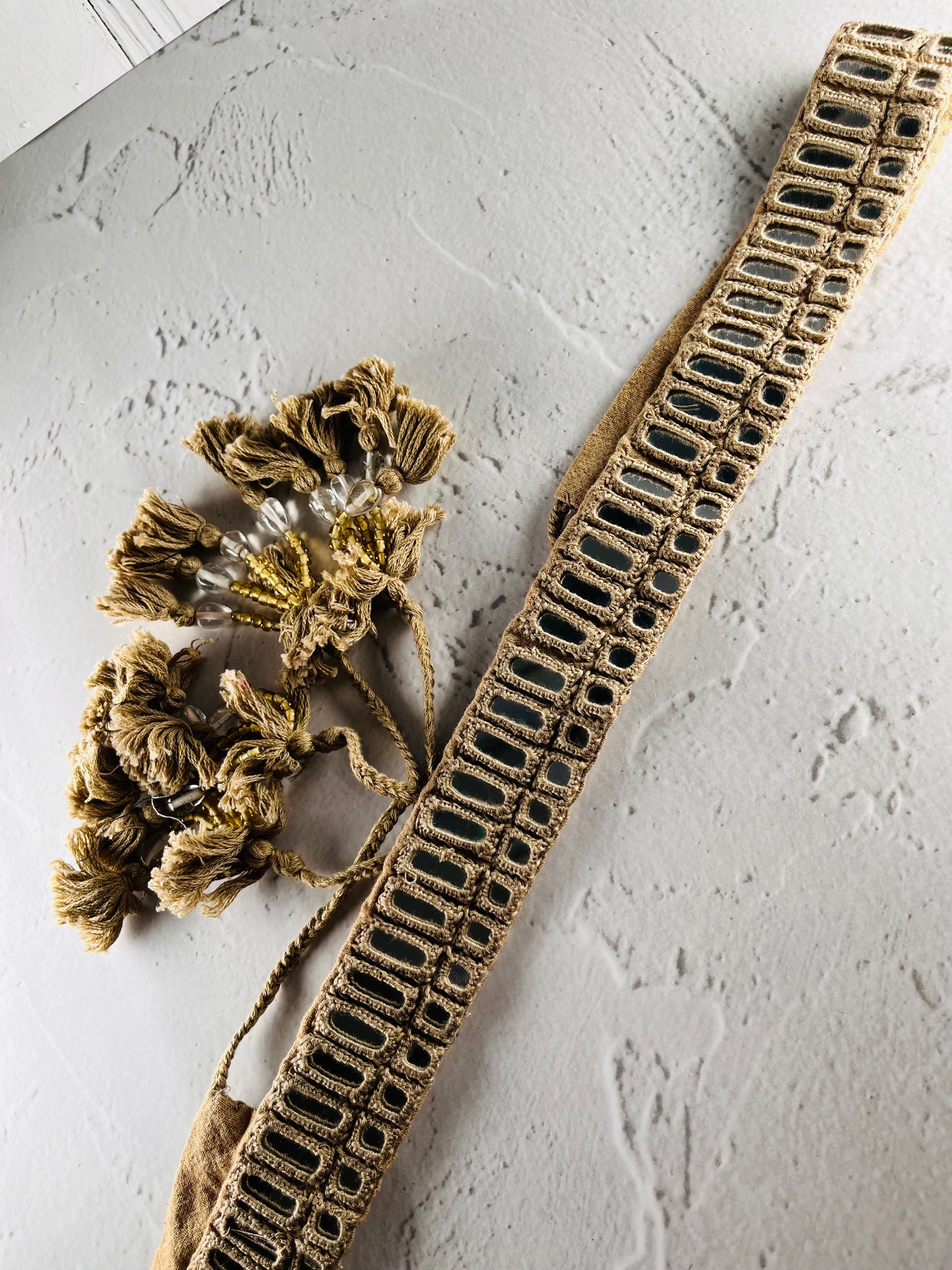 - Elevate your fashion game with our Kutchi Handwork Waist Belt featuring intricate tribal craftsmanship. Adorned with triangle mirrors, it’s the perfect fusion accessory, adding flair to dresses and jeans alike. Achieve a unique and stylish look effortlessly.