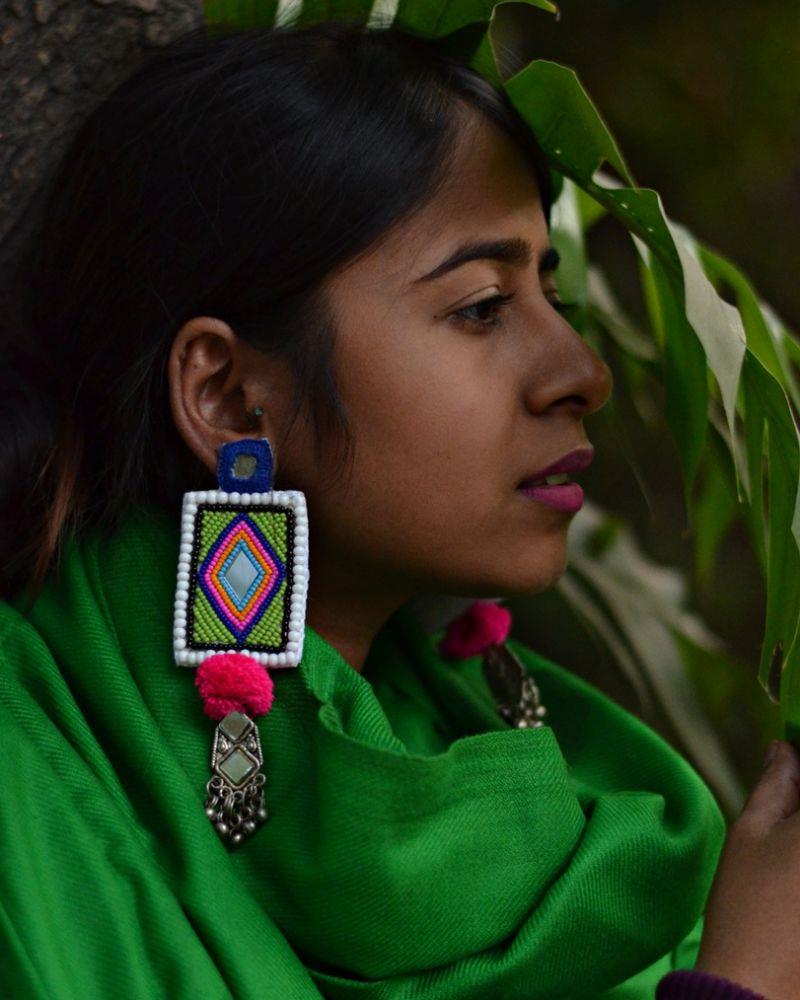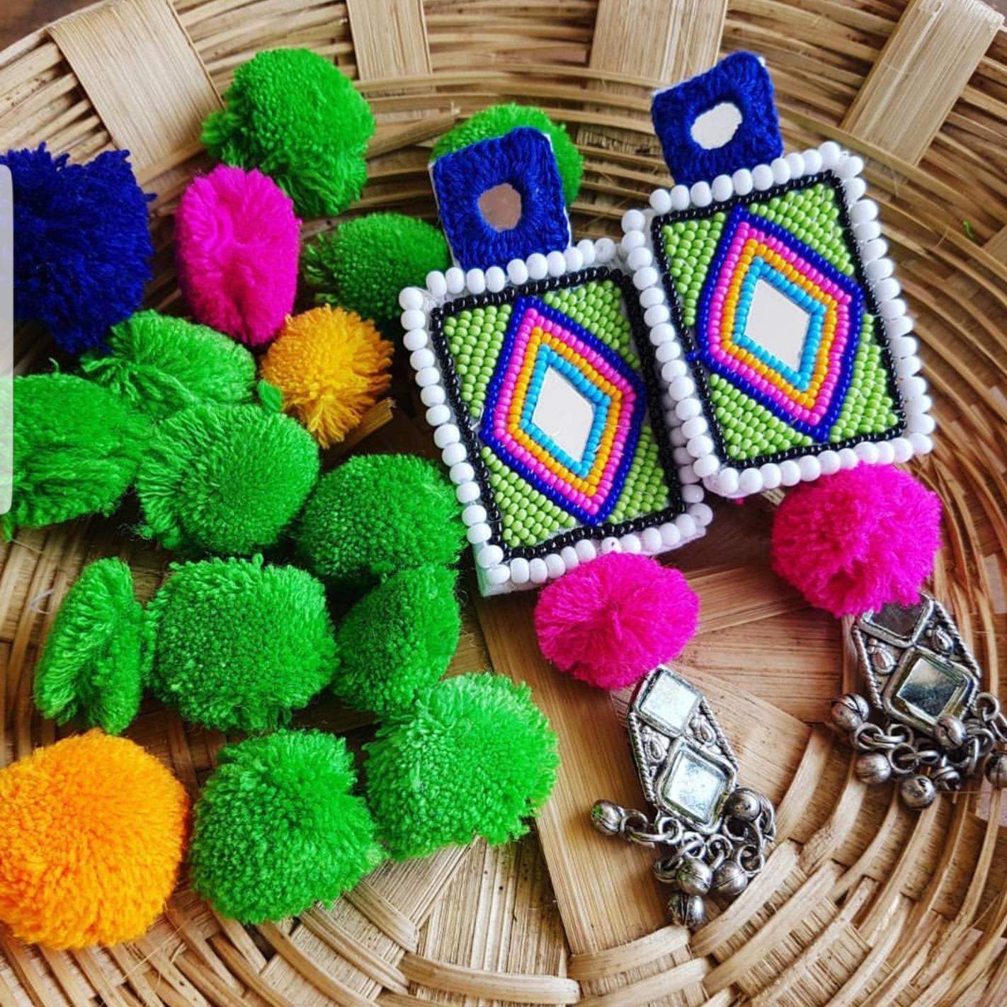 - Elevate your festival look with Kruti Arts’ Handcrafted Earrings. Expertly made with beads, cotton fabric, and oxidised metal, these earrings come in vibrant Black, Blue, Pink, Light Green, Orange, and White. Perfect for adding a pop of color and style to your occasion attire.