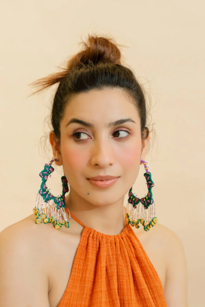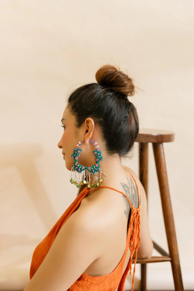 Add elegance to your look with these handcrafted Navagio earrings from Kruti Arts. Made with high-quality materials like cotton fabric, silk threads, and beads, these lightweight earrings feature vibrant butterflies and flowers, perfect for any occasion.