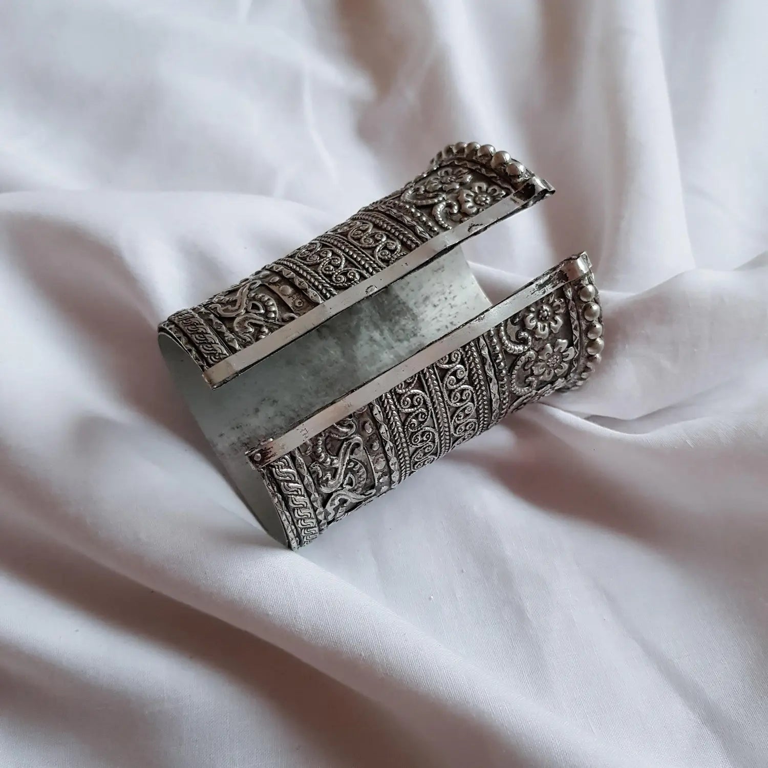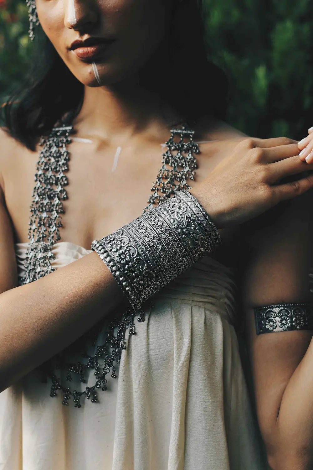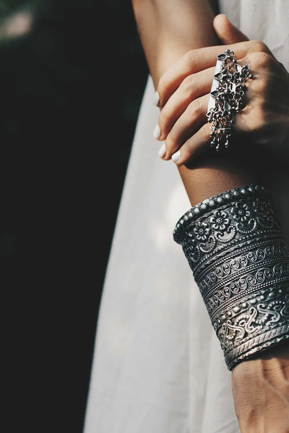 - Oversized Layered Kada is a silver bangle that can be worn for Navratri festival, everyday, party, or wedding. It is made of brass with German silver coating and has an antique polish.