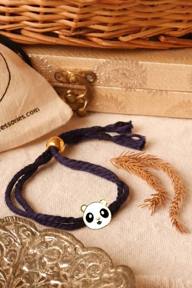Celebrate Raksha Bandhan with our Panda Rakhi, a charming gold-plated bracelet. Featuring a cute panda design, this handmade piece is perfect for animal lovers. Made from high-quality 18kt gold plated brass, its a unique addition to your rakhi collection.