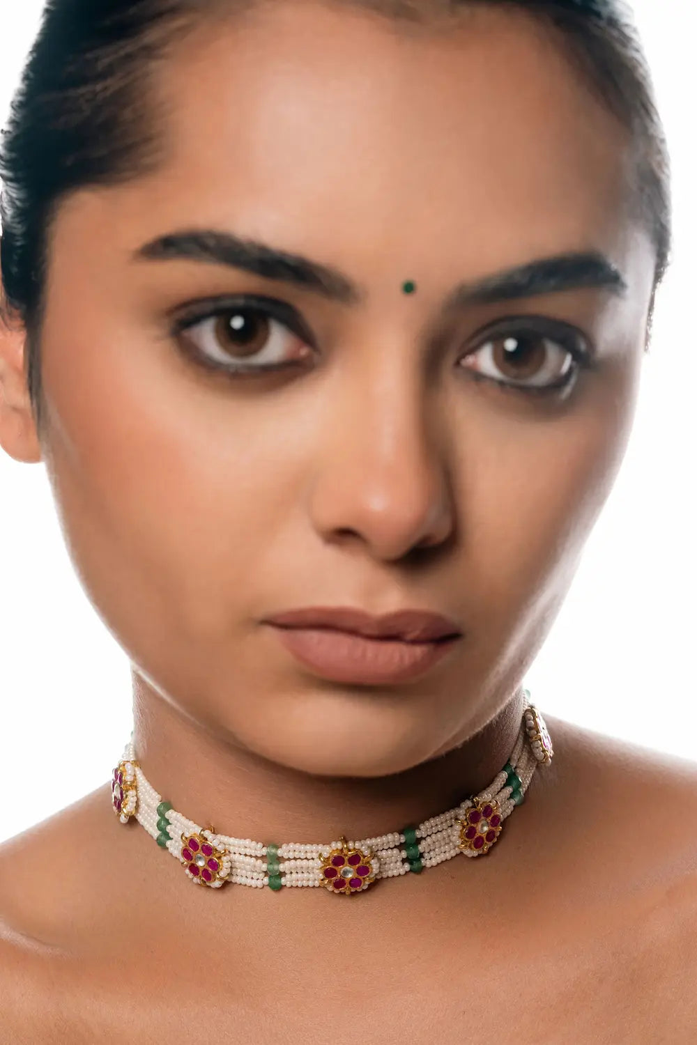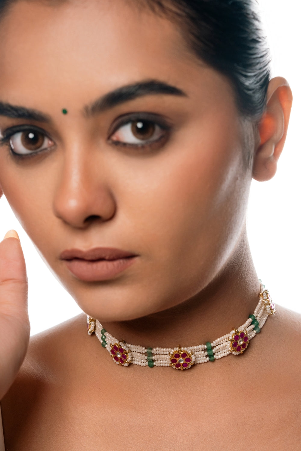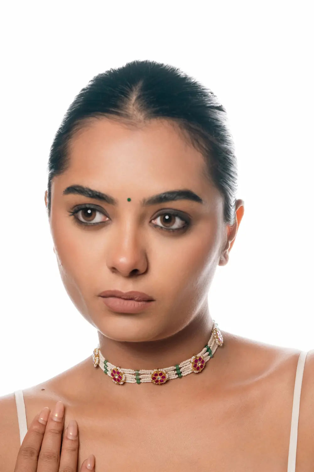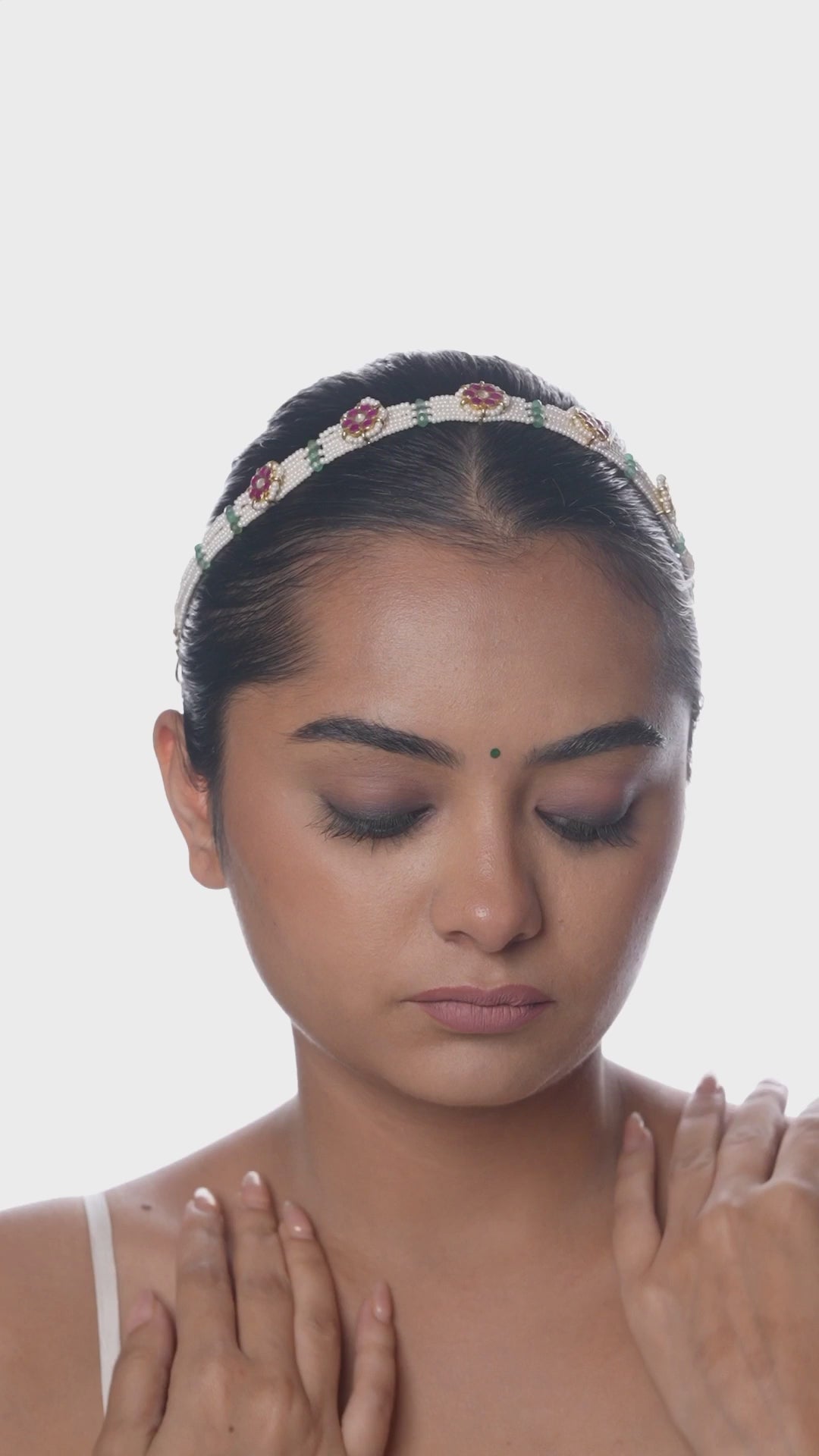 Adorn yourself with this exquisite pink flower design Matha Patti, intricately crafted with small white beads. Perfect for special occasions, this Matha Patti elevates your traditional look, adding elegance and charm with its unique beadwork and floral touch.