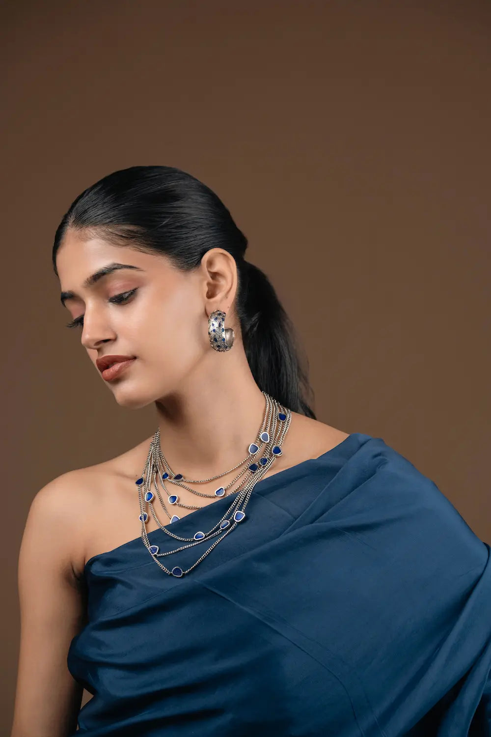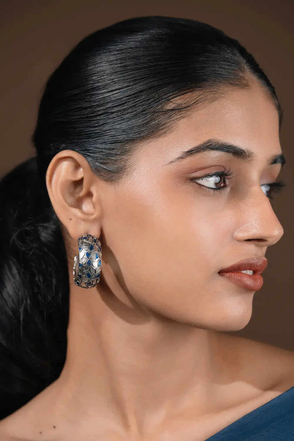 Stunning Raas Leela Hoops is all things stunning and versatile. It is most definitely going to add an oomph to your style statement. It reflects the power of minimalism yet striking a balance of statement as well as elegance. Style this striking piece with statement outfits: kaftans, dresses, shirts and traditional outfits. The silver and sapphire blue enamel make this piece versatile, wearable and unique for you to hold on to forever.