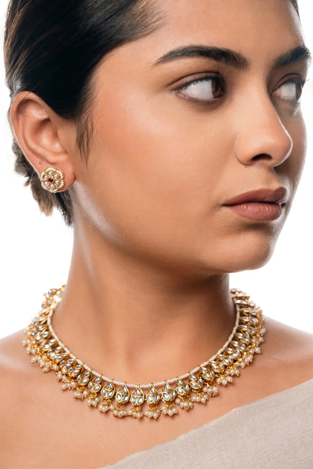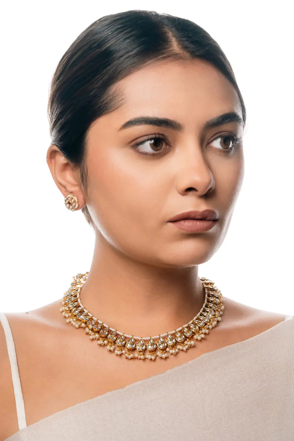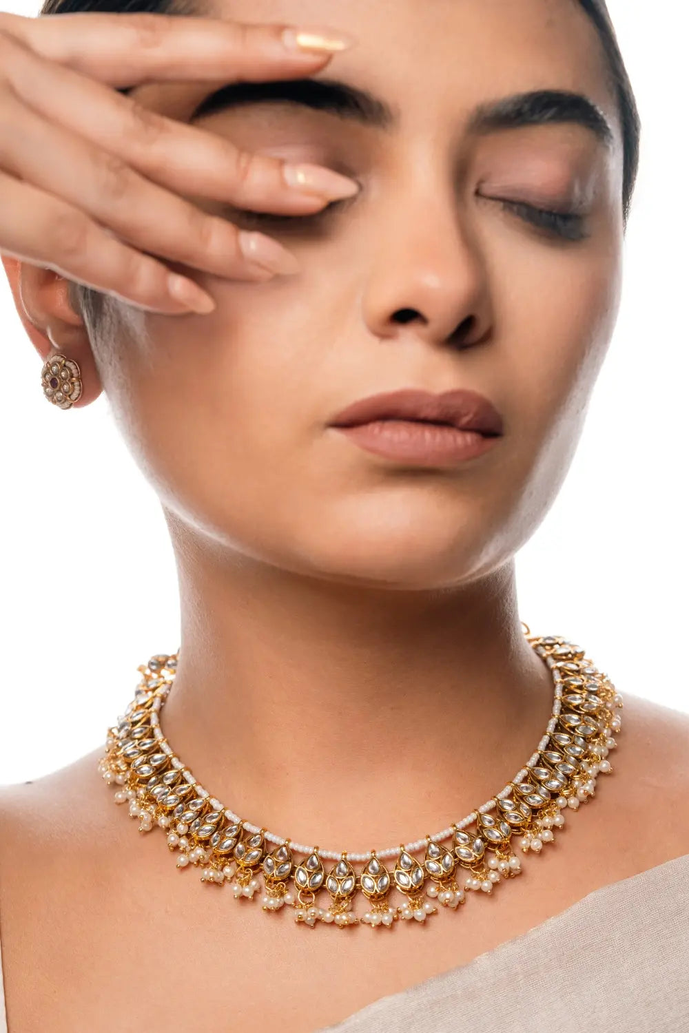 This pearl-embellished gold-toned necklace features intricate detailing with teardrop-shaped designs, adding a regal touch to your ensemble. The delicate white beads enhance its elegance, making it perfect for special occasions or adding a sophisticated charm to your everyday look.