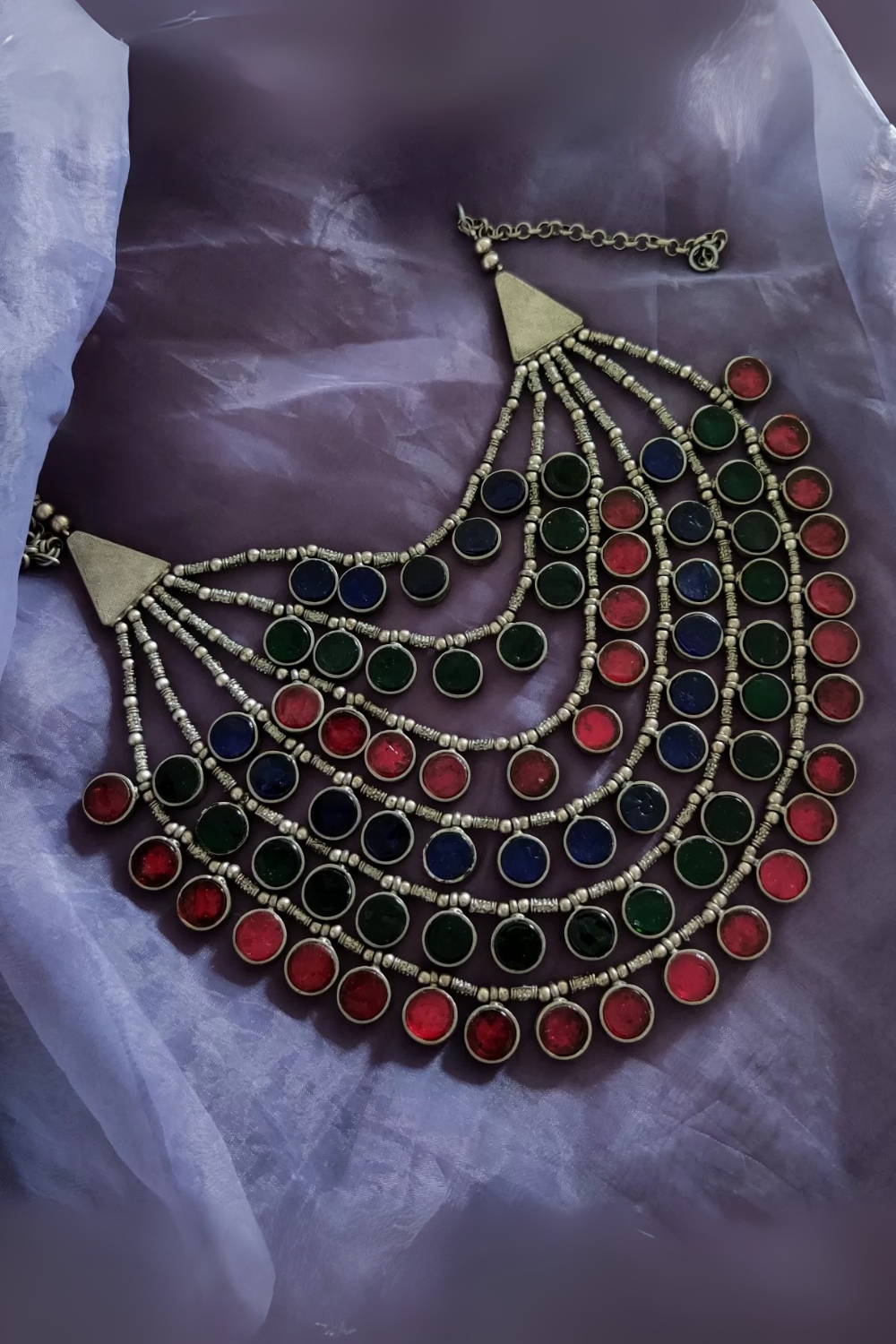 The Rajasthani Glasswork Necklace is a traditional neck piece designed for the Navratri festival, weddings, parties, and everyday wear. This necklace is available in silver, green, blue, and red colors. It is crafted with a brass base and coated with German Silver, which enhances its durability and longevity. The hand-cut tinted glass adds a touch of elegance and sophistication to the necklace. The Rajasthani Glasswork Necklace is a perfect accessory for those who appreciate traditional jewelry and desire to add a touch of glamour to their attire.