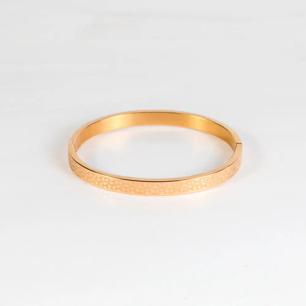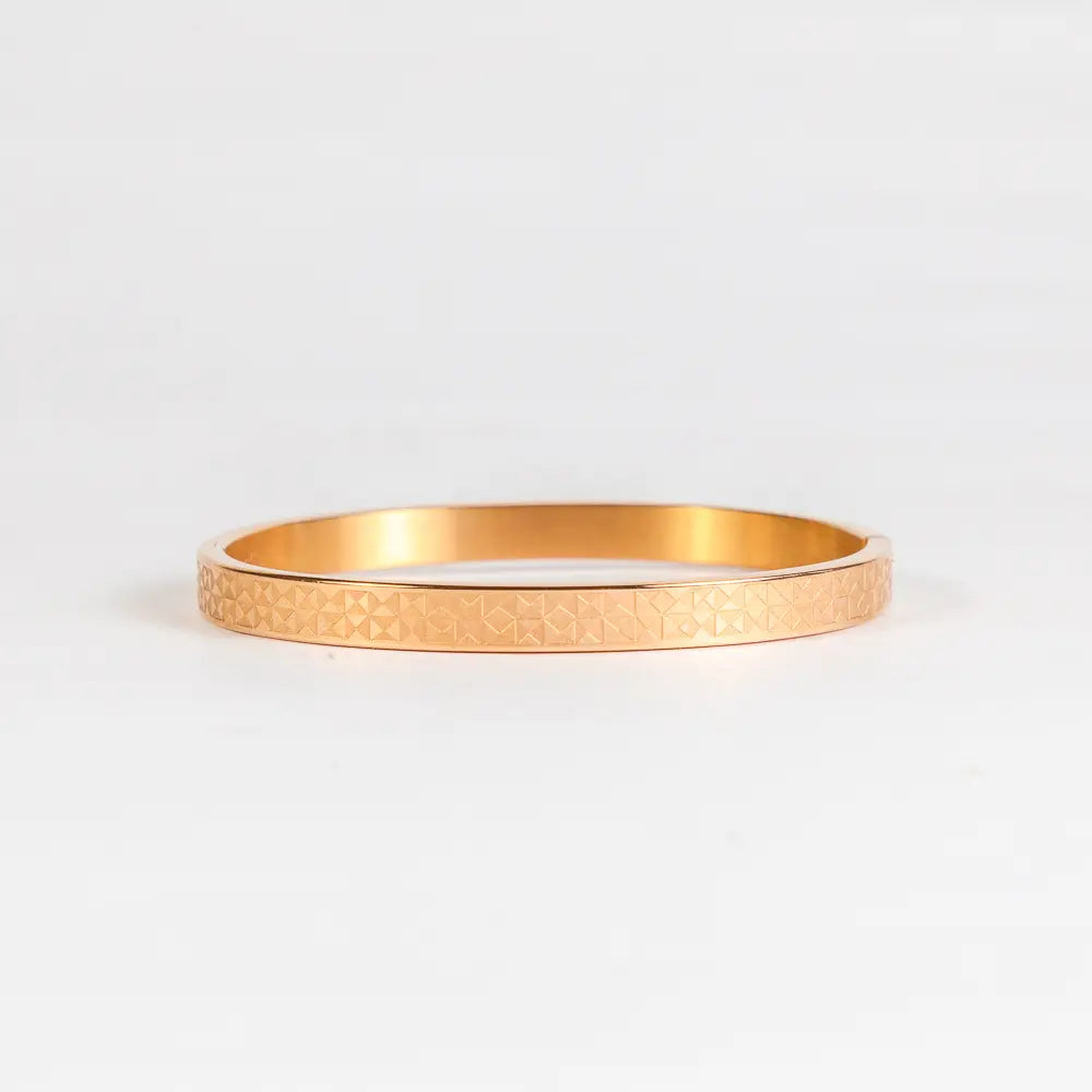 This rose gold open bracelet is crafted from high-quality stainless steel with a geometric design. It features a durable, anti-tarnish finish, making it perfect for daily wear and versatile enough for any outfit.