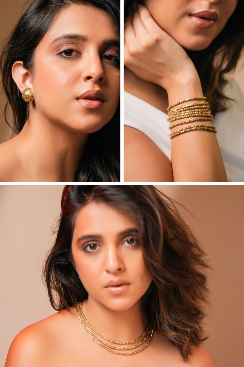 Every piece in the Ruhi Combo is handcrafted from high-quality brass, giving it durability, shine, and an artisanal touch. The necklace’s 3 layers are carefully balanced for comfort and elegance, while the studs and bracelet add a touch of sophistication to complete your look.