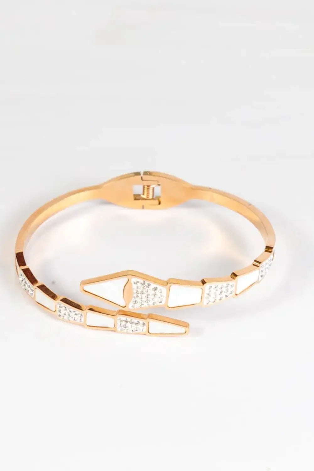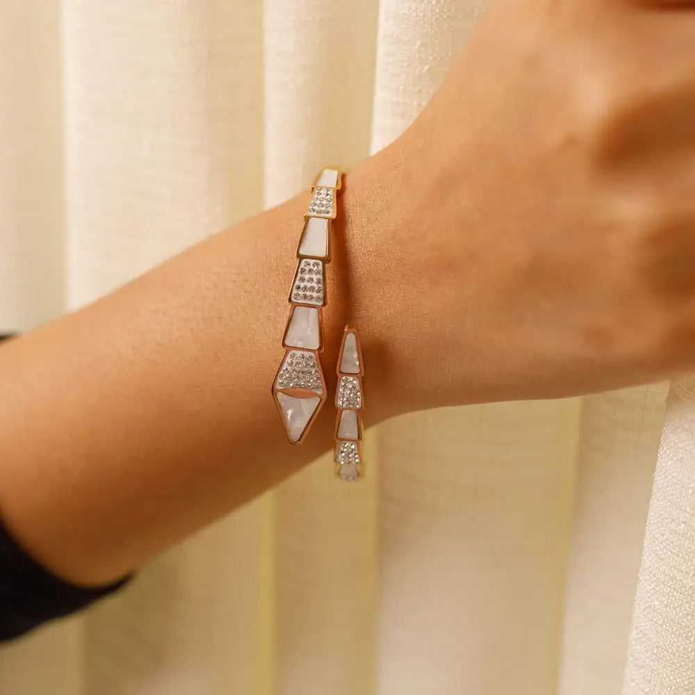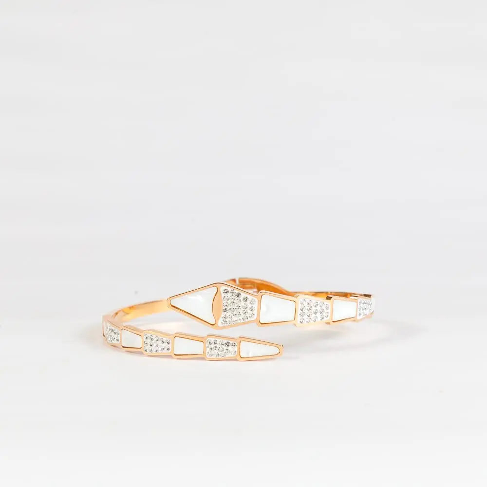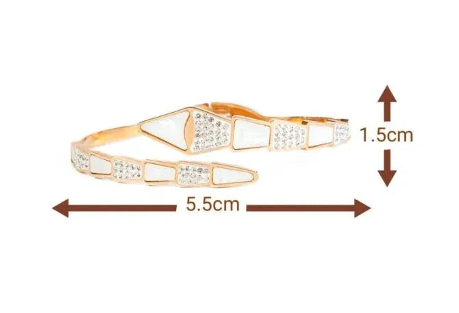 Unleash the charm of our Serpent Bracelet, a mesmerizing piece blending golden, white, and rose gold hues with sparkling cubic zirconia. This unique openable bracelet, crafted from anti-tarnish materials and adorned with American diamonds, redefines luxury. Its innovative design, resembling a serpent, offers both elegance and a bold statement. This high-quality jewel that promises to captivate and allure with every wear.