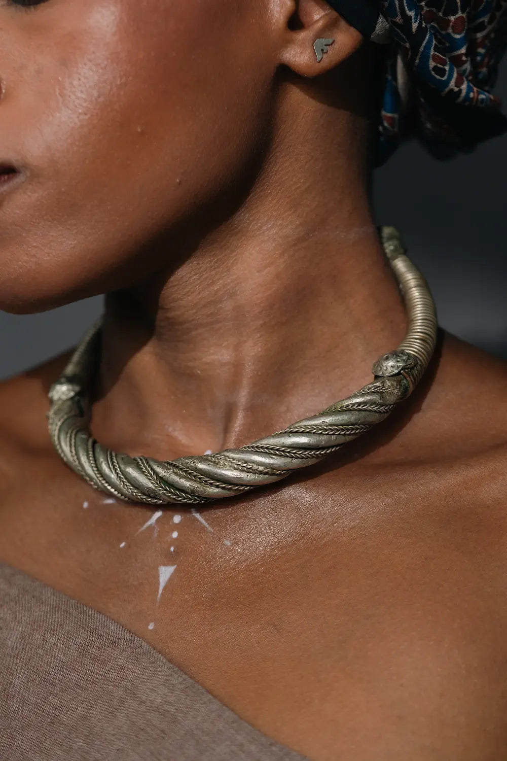 This handmade German silver hasli necklace features an ornate, multi-strand design shaped into a graceful semi-circle. Intricate floral and geometric patterns add delicacy to its bold structure, reflecting expert tribal craftsmanship. With an aged silver patina and a history spanning over 20 years, it carries the richness of tradition and artisan skill. A striking piece of heritage jewelry, ideal for ethnic styling and collectors of vintage silver.
