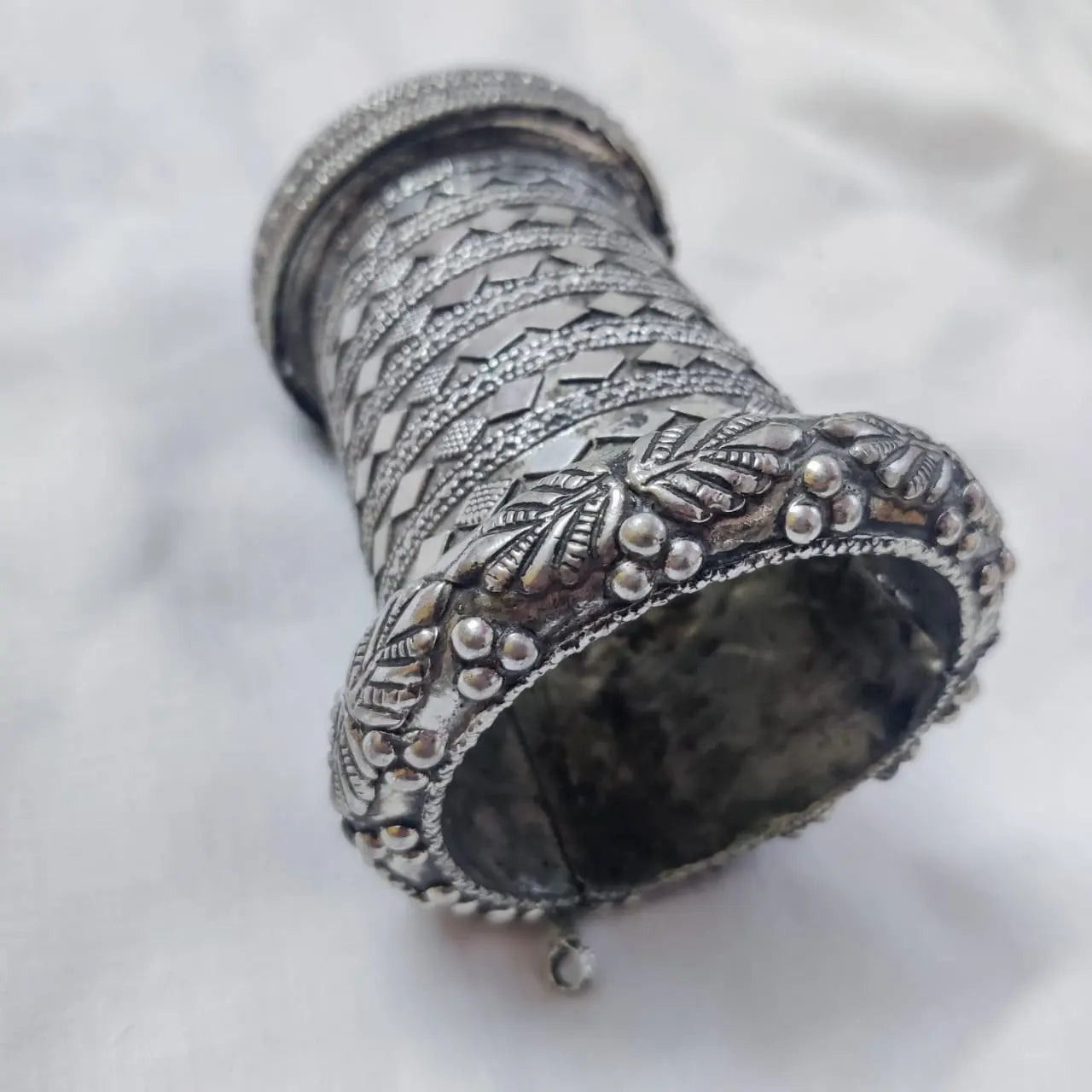 - The stunning Silver Diamond Kada bangle, perfect for Navratri, everyday wear, parties, and weddings. Crafted with a brass base metal and coated with German silver, this bangle boasts an antique polish that exudes elegance and sophistication. Elevate your style with this must-have accessory.