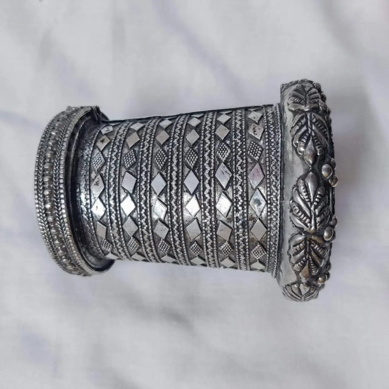 The Silver Diamond Kada is a bangle designed for the Navratri festival, as well as for everyday wear, parties, and weddings. The bangle is made of brass as the base metal, with a German silver coating and an antique polish. The combination of materials and finishes creates a unique aesthetic that is both elegant and traditional. The Silver Diamond Kada is a versatile accessory that can be worn on various occasions, making it a valuable addition to any jewelry collection. Its durability and quality craftsmanship ensure that it will last for years to come.