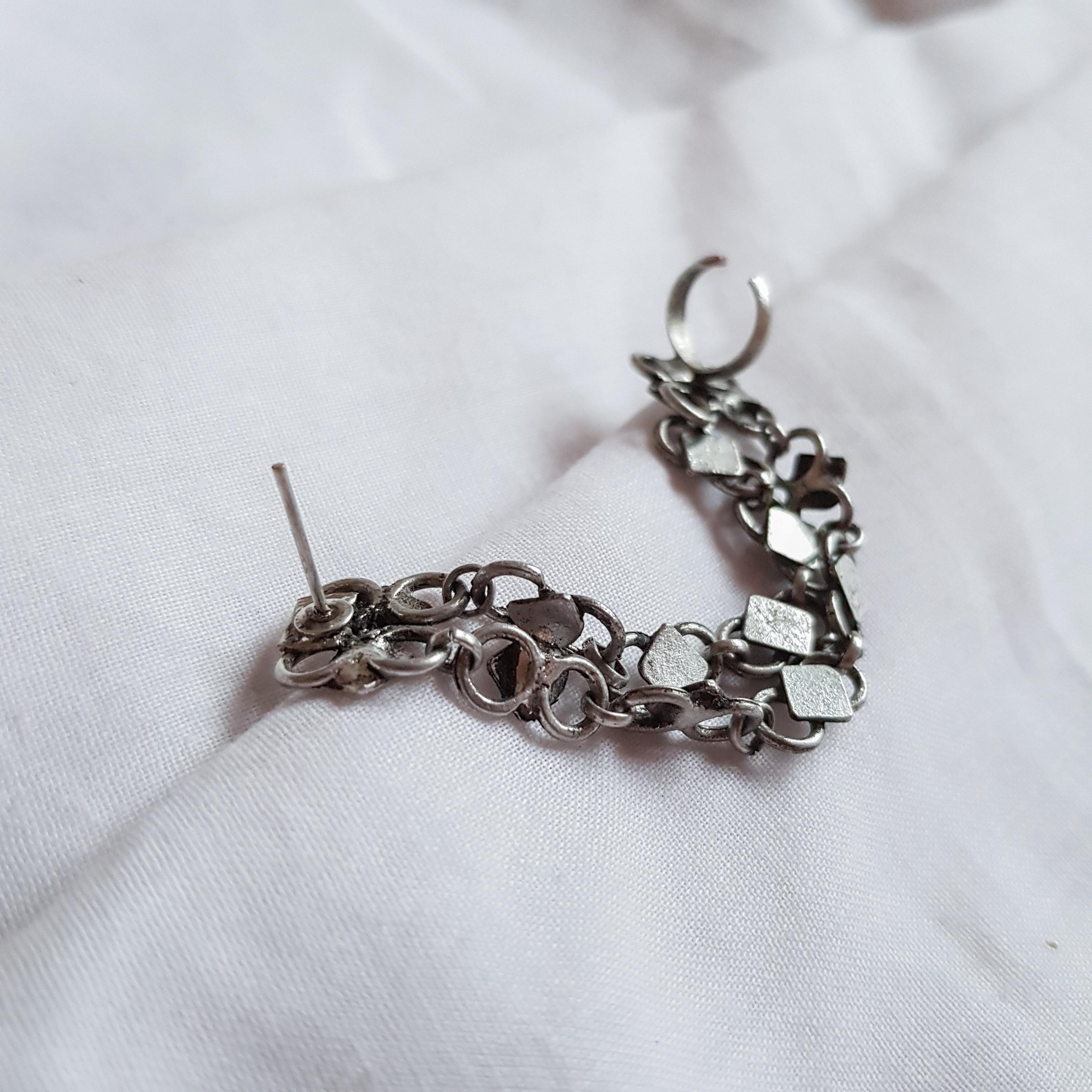 Crafted in antique-finished German silver, these earcuffs feature layered diamond motifs and a gently draped chain that hugs the ear. With a secure stud and clip closure, this piece blends edge and elegance without needing any extra effort.
