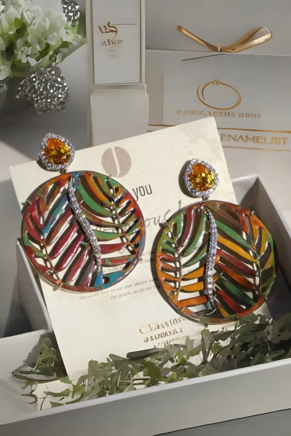 Get ready to turn heads with the Sukra Earrings! These bold and vibrant accessories are the perfect addition to any outfit, whether you're dressing up for a night out or adding a pop of color to your everyday look. Made with high-quality materials including copper, vitreous enamel, 925 silver, and natural CZ, these earrings are built to last. The stunning combination of orange, green, and yellow colors is sure to make a statement wherever you go. Don't settle for boring earrings add the Sukra Earrings to your collection today and elevate your style game!