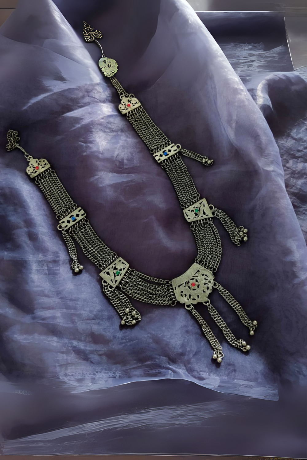 The Turkmen Carved Necklace, an exquisite long necklace, embodies the essence of tradition and elegance. Crafted with utmost precision, this necklace is a perfect accessory for various occasions such as festivals, weddings, parties, and even everyday wear. Its captivating design showcases a harmonious blend of silver, red, and green hues, enhancing its aesthetic appeal. Meticulously constructed with a brass base and adorned with a German Silver coating, this necklace exudes durability and sophistication. The hand-cut tinted glass embellishments further elevate its allure, making the Turkmen Carved Necklace a timeless piece of artistry.