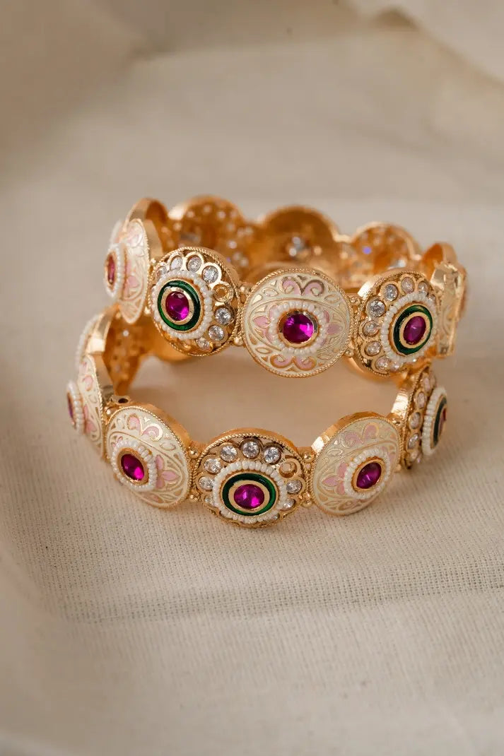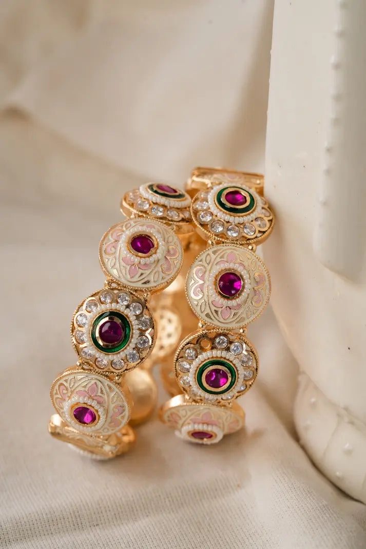 Exquisite multi-color Kundan bangles feature intricate enamel work, gemstone accents, and a timeless circular design. Crafted from high-quality brass, they offer adjustable sizing, premium durability, and a luxurious combination of pink, green, and white gemstones for a vibrant, elegant look.