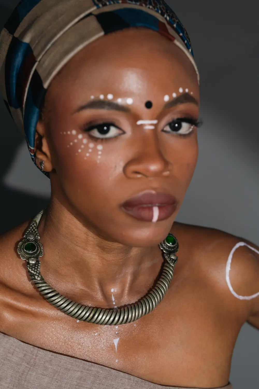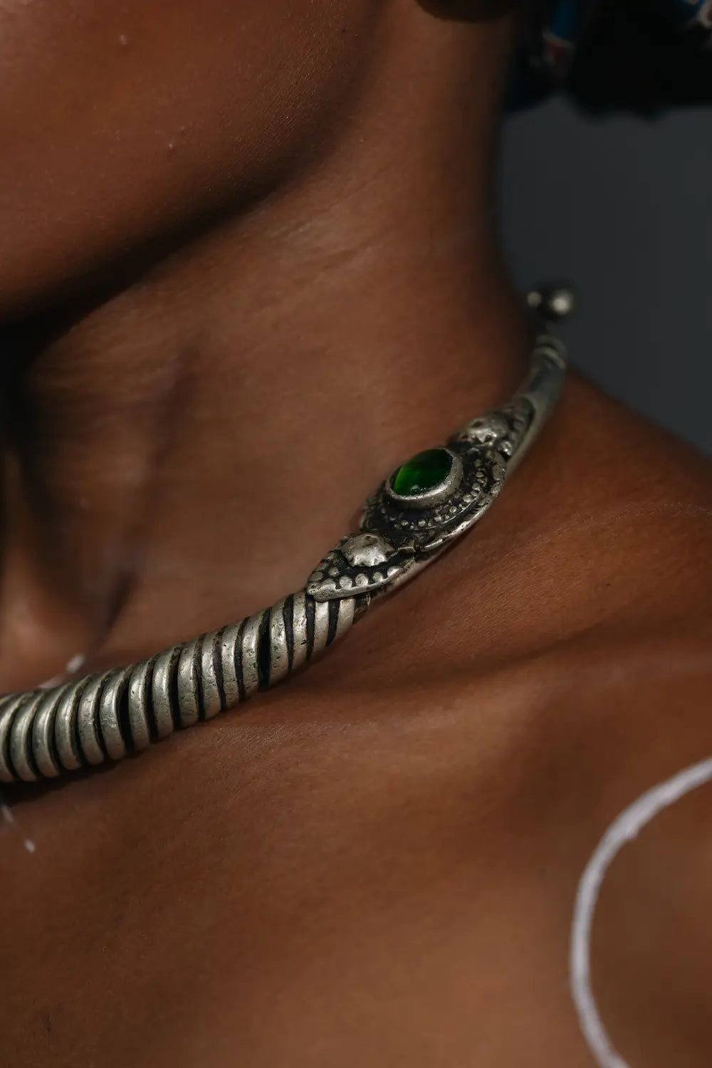 Bold and rooted in tradition, this vintage German silver hasli necklace is a powerful expression of tribal artistry. Its rigid, coiled frame curves closely around the neck, handcrafted with a richly textured braided surface. Each end is finished with ornate circular caps, holding striking green stones that glow against the muted silver. Over two decades old, this piece carries the quiet strength of age and the precision of artisan hands. A rare Complimento find that speaks of culture, craft, and character.