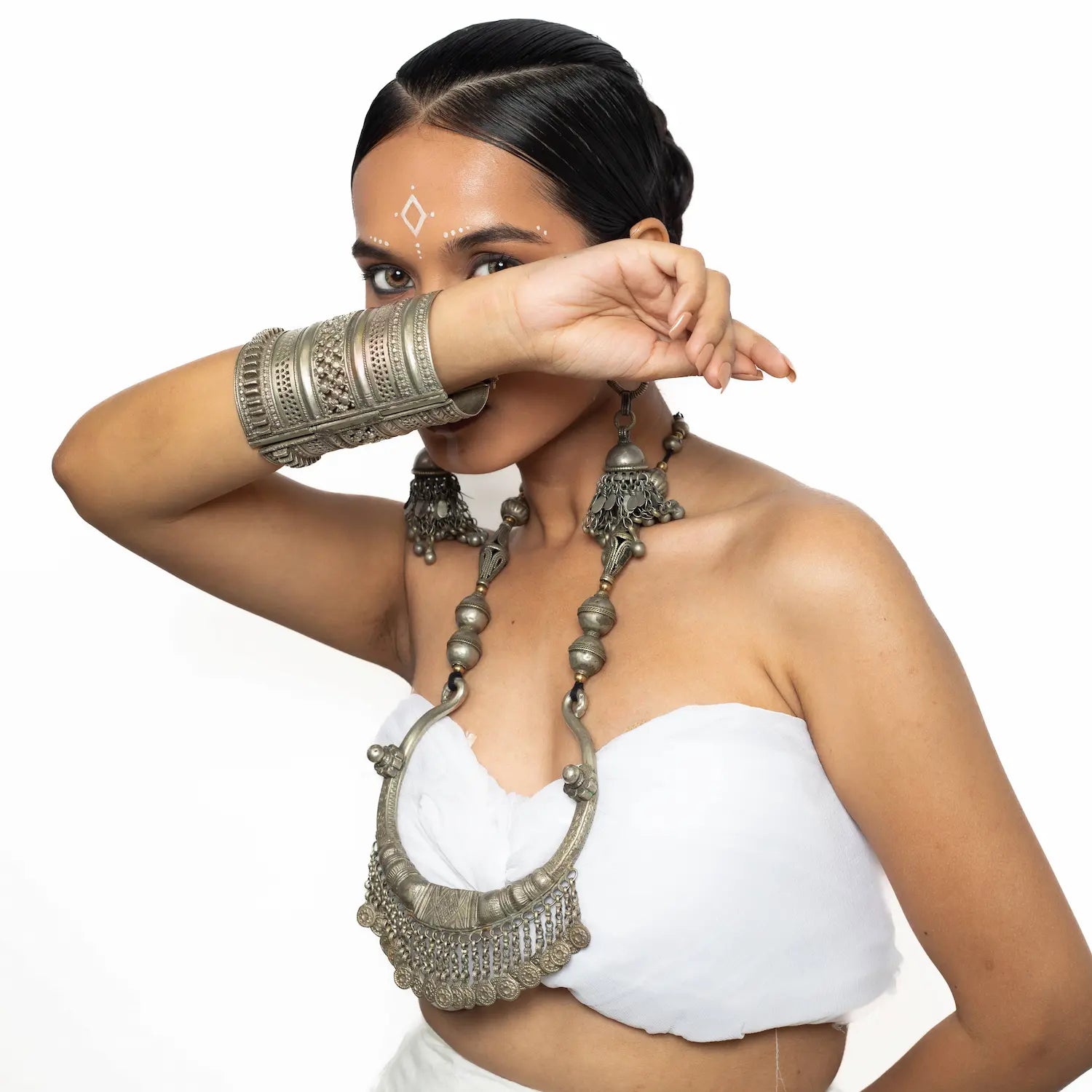 Hey there fashionistas! Want to add some boho-chic vibes to your wardrobe? Our Afghani Jewellery WRIST STACK KADA is the perfect accessory for you! Made from antique silver and brass, this kada is a versatile piece that can take you from casual to party mode in no time. Wear it with your favorite jeans and tee for a laid-back look or pair it with a flowy dress for a bohemian vibe. This kada is perfect for any occasion, from weddings to festivals. So what are you waiting for? Get your hands on our WRIST STACK KADA and elevate your style game!