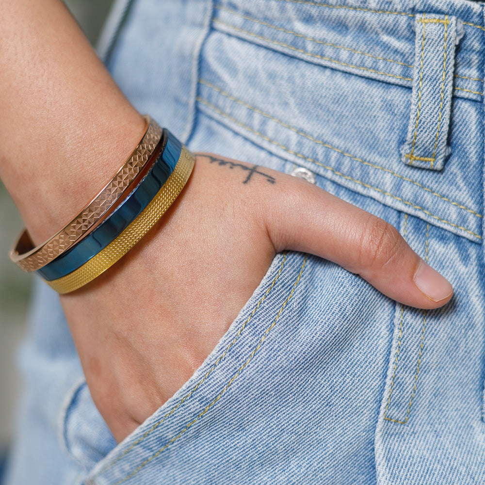 Experience the fusion of style and durability with the Blue Luster Stainless Steel Bracelet. Featuring a unique anti-tarnish, openable design, this daily wear bracelet combines contemporary aesthetics with practicality.